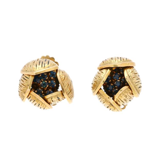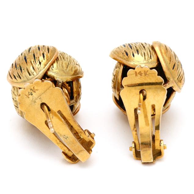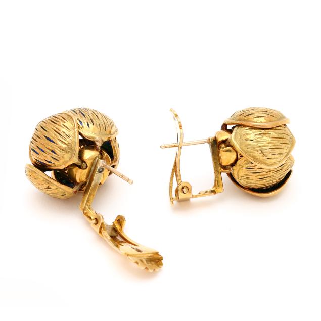 The naturalistic floral motif earrings with textured petals opening to reveal blue and green enamel to the interiors and centering on round cut sapphires set en tremblant, completed with post and omega clip backs stamped 14K, earrings testing 18KT.