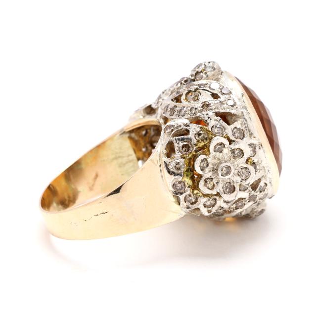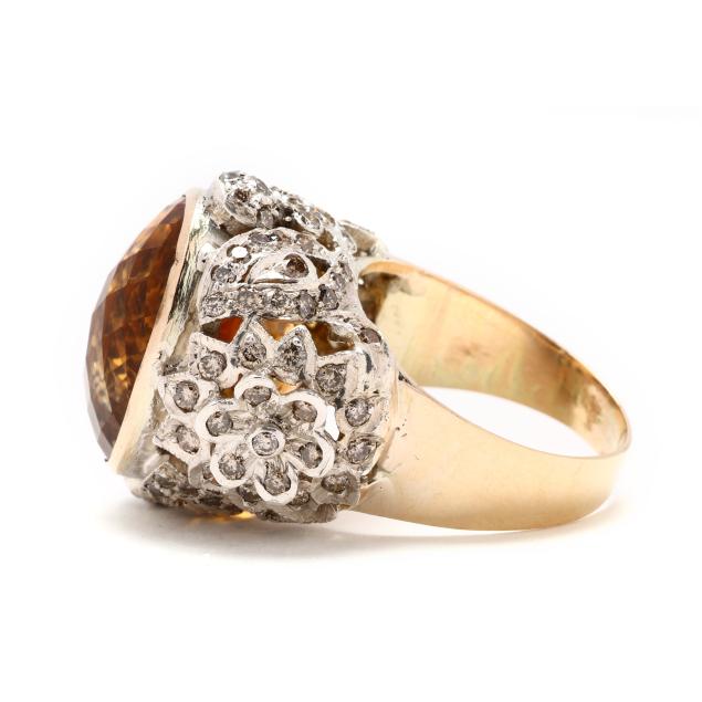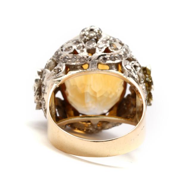 The silver top centered on a bezel set oval checkerboard cut citrine (17 x 13 x 13 mm) weighing approximately 16.50 carats, with floral and foliate openwork motif to gallery set with full cut round diamonds weighing approximately 1.35 total carats (Light Brown color, I1-I2 clarity), completed with a gold shank testing 14KT.