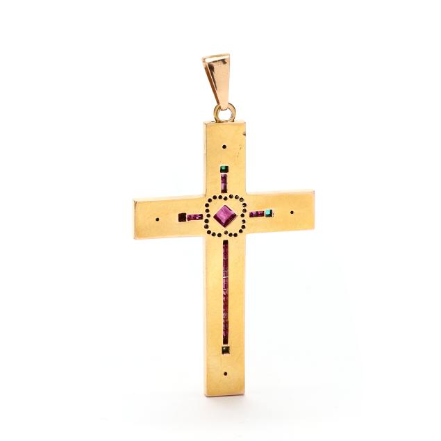 Centered on a square cut synthetic ruby within a surround of polki cut diamonds, and set to the stem and crossbar with square cut synthetic and natural rubies and emeralds, the ends with scrolled and quatrefoil engraving and set with a round cut synthetic emerald, completed with a bail, testing 14KT.