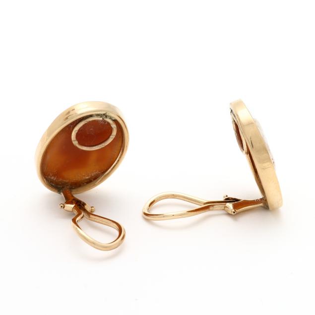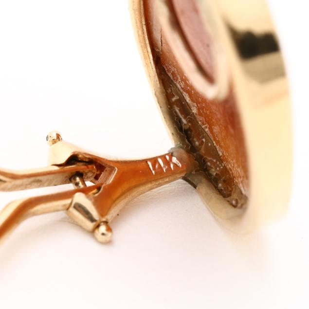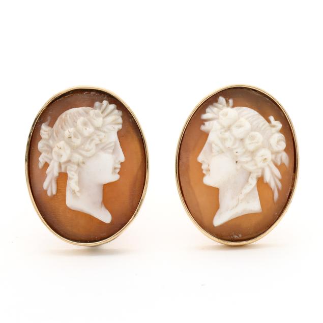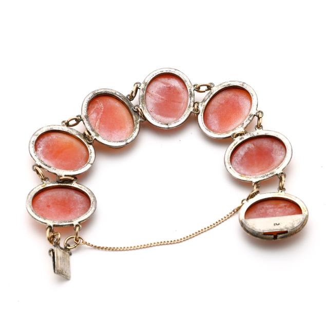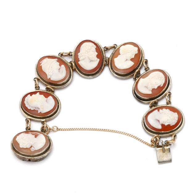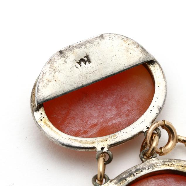 To include: a bracelet with links bezel set with carved shell cameos each depicting a profile of a Greco-Roman figure, completed with an integrated box clasp, with indecipherable stamp, XRF testing sterling silver (24mm x 7 in.) (good estate condition); and a pair of gold earrings bezel set with carved shell cameos depicting a profile of a classical woman, completed with ear clips, stamped 14K, XRF testing 12KT (21 x 16mm) (good estate condition).
