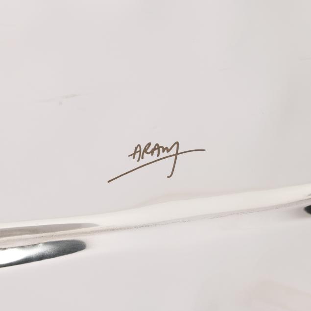Contemporary, large stainless steel platter, marked "Aram" to underside, includes original cloth sleeve and care information label.