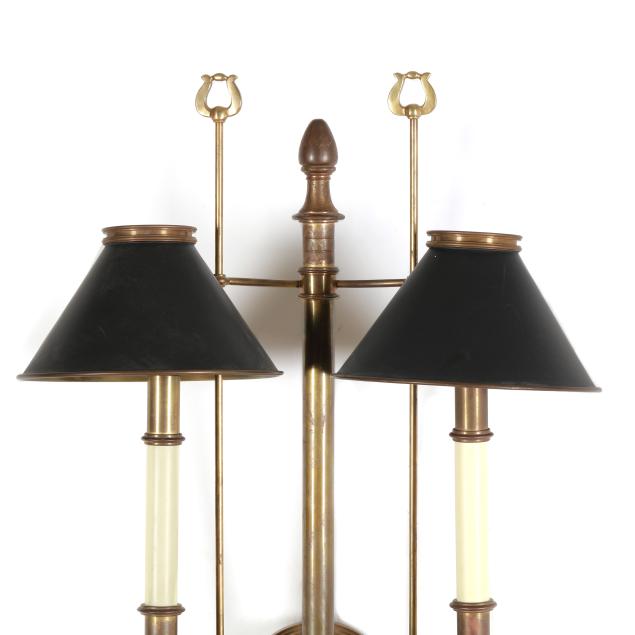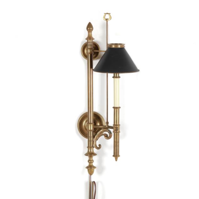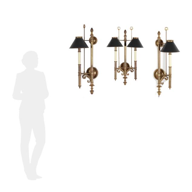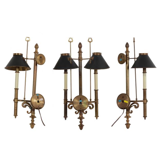 1993, (3) brass electrified candelabra sconces with black toleware shades including a pair of single-light sconces; and a two-light sconce, labeled.