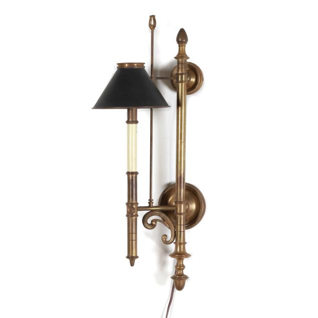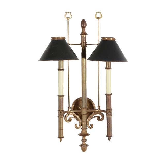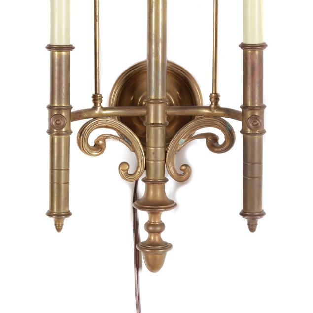 Working at time of evaluation; some small areas of verdigris and tarnish to brass finish; two-light sconce with break to one wall mount.