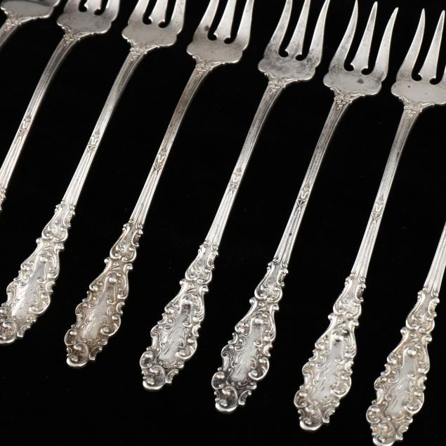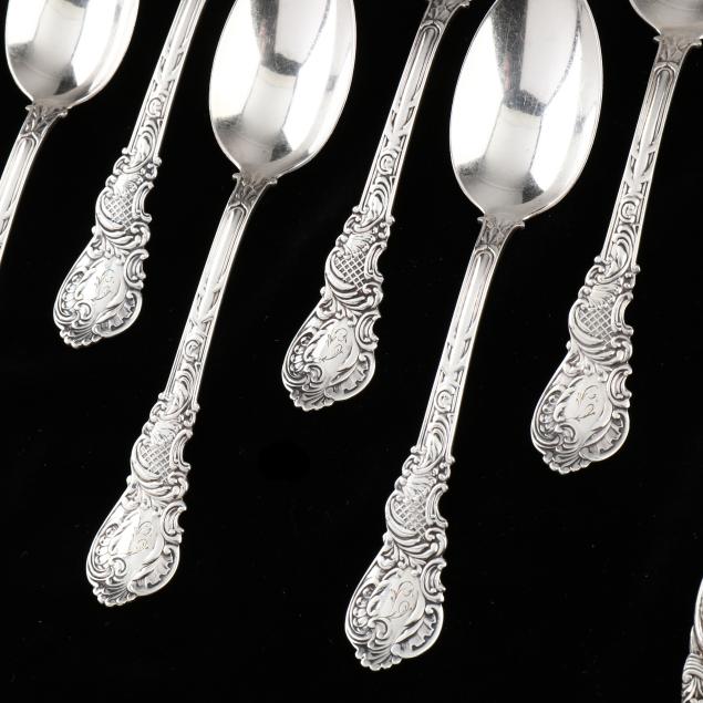 Dresden teaspoons, patented 1885, monogrammed; (6) five o'clock teaspoons and (12) oyster forks in the Gorham