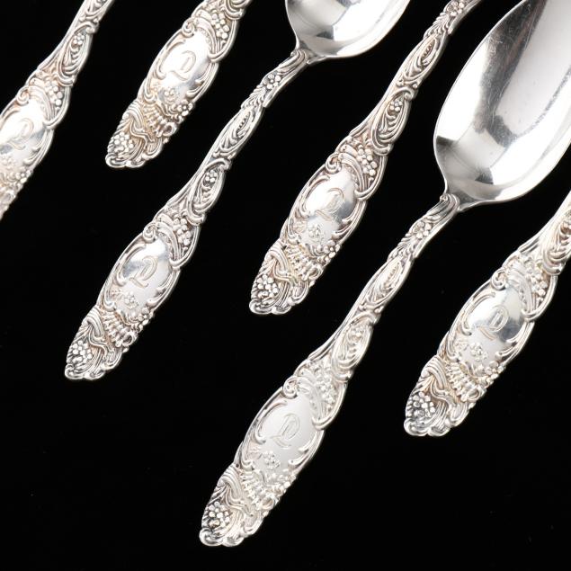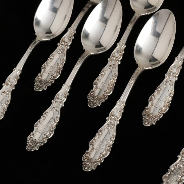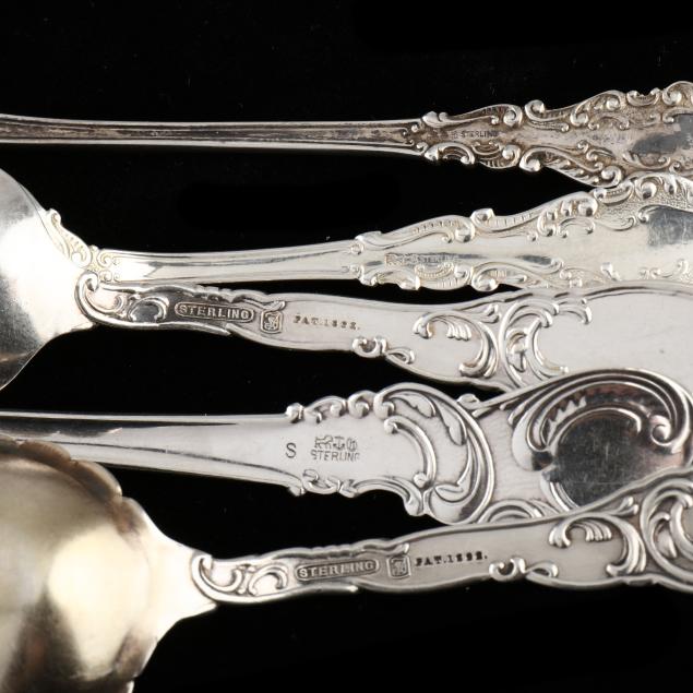 Luxembourg pattern, patented 1893, monogrammed; and (6) teaspoons and a sugar spoon in the Towle