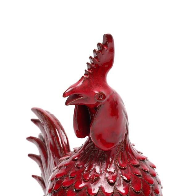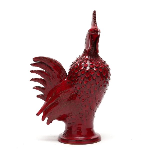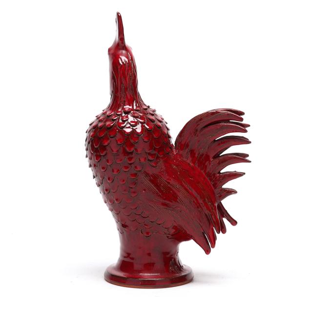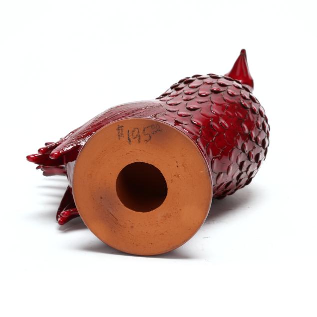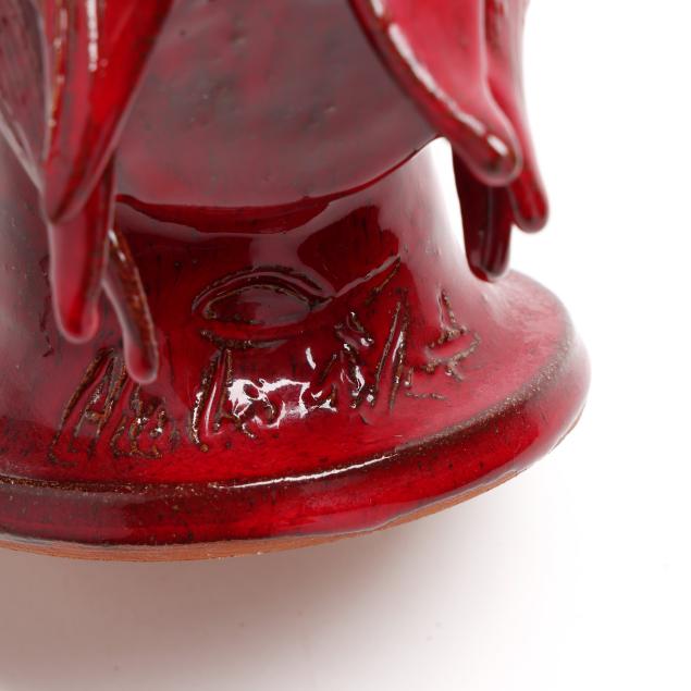 Cleveland, Georgia, late 20th century, molded and turned earthenware, signed underglaze on the pedestal base with fish cipher, featuring an allover deep crimson glaze, with nicely tooled body, double tail feathers and wings.
