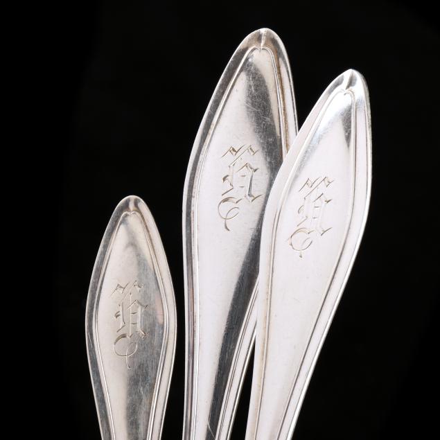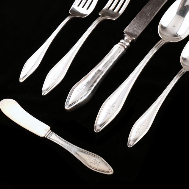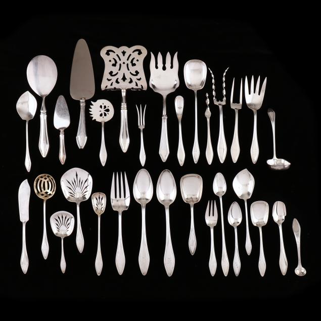 (110) pieces to include: (2) dinner knives (10 in.); (7) dinner knives (9) in.; (9) dinner forks (7 1/4 in.); (14) salad forks (6 1/4 in.); (15) teaspoons (6 in.); (1) five o'clock teaspoon; (6) oval bowl place spoons; (4) ice cream forks; (6) iced tea spoons; (6) oyster forks; (11) flat handle butter spreaders; a pastry server; an asparagus server; (2) tablespoons; a large serving spoon; a sauce ladle; (2) jelly spoons; a tomato server; a medium serving spoon; a sugar spoon; a pierced serving spoon with gold wash; (2) potato forks, one with twisted tines; a chipped beef fork; a cold meat serving fork; a cucumber server; a butter pick; an olive spoon; a lemon fork; a master butter knife; a marrow scoop; a bon bon spoon; a horseradish spoon; a pickle fork; a mustard ladle; a cheese knife; a large serving fork; and a pie server; various monograms.