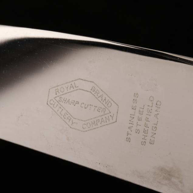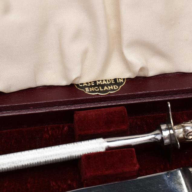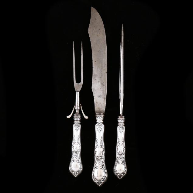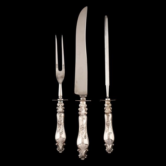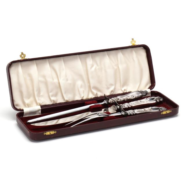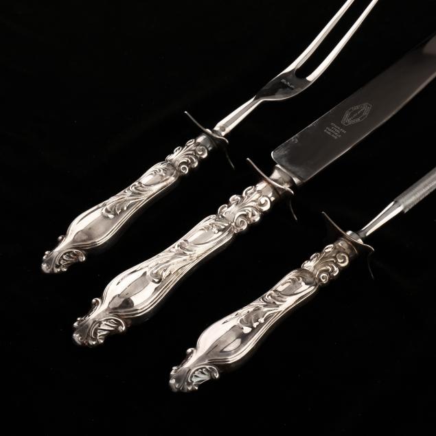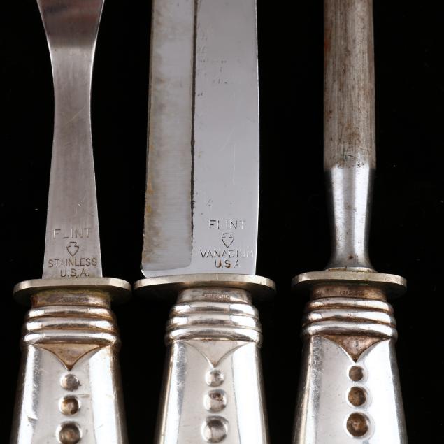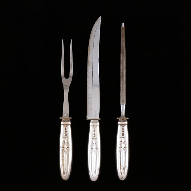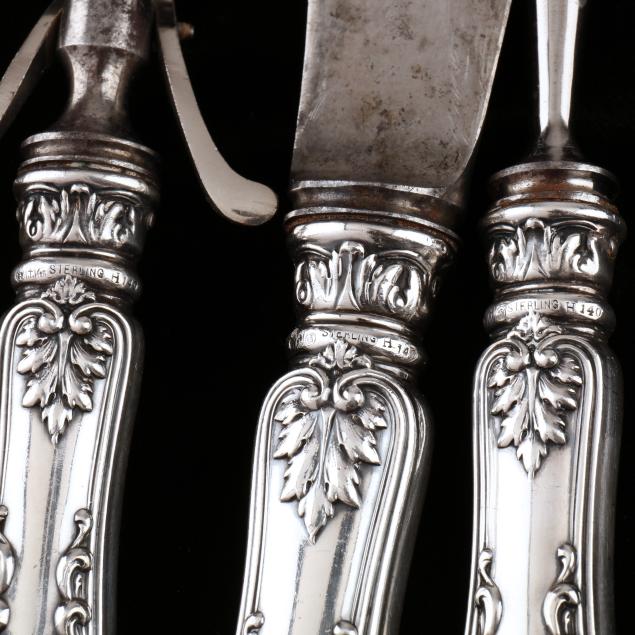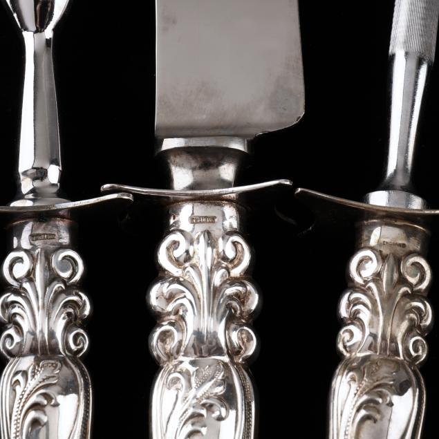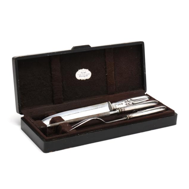 All including a carving knife, fork and honing steel; the first, a sterling silver set by Gorham; the second, an English cased set with silver-plated handles marked "England"; the third, a modernist sterling silver cased set by Flint, marked "sterling" to the handles.