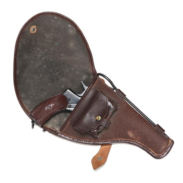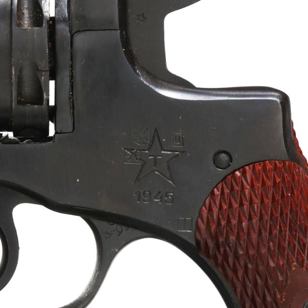 Serial number NG00391 present on blued revolver action frame, prrof and arsenal markings present over entirety of the firearm, TULA arsenal mark and 1945 present on left side of frame, exposed hammer, dovetail front sight blade, lanyard loop, lanyard, BAKELITE grip scales, holster, cleaning rod and screwdriver.