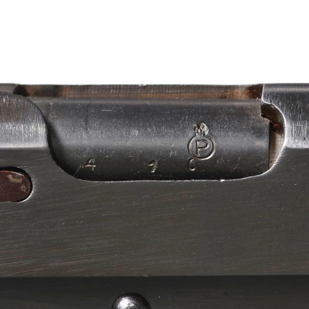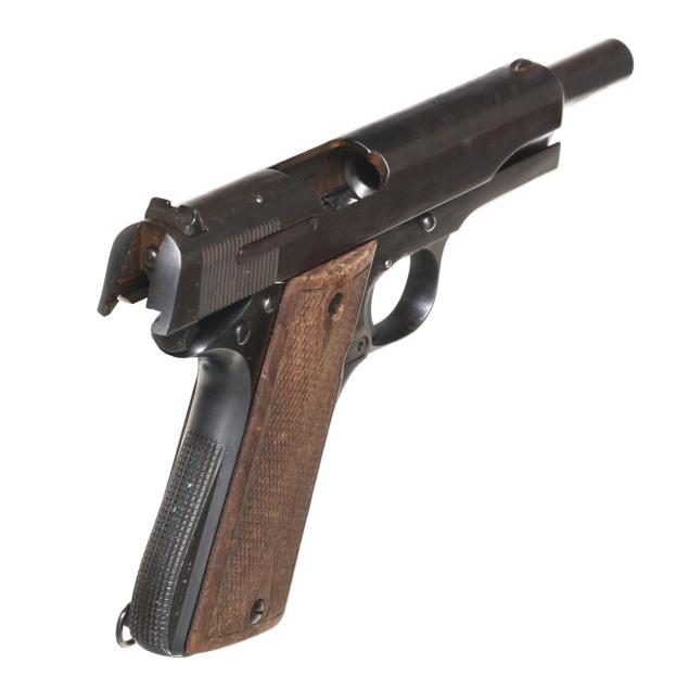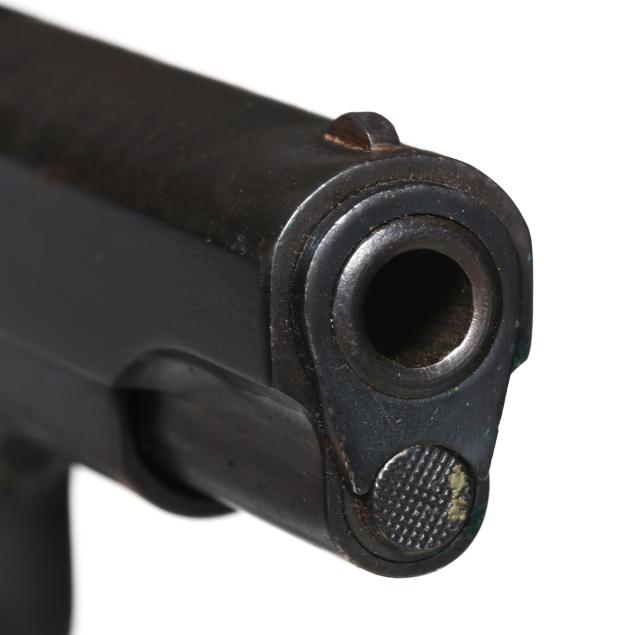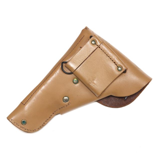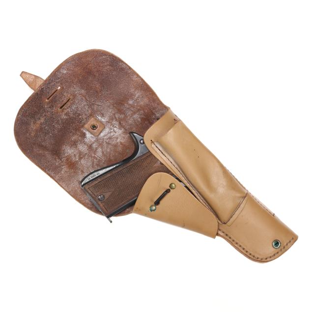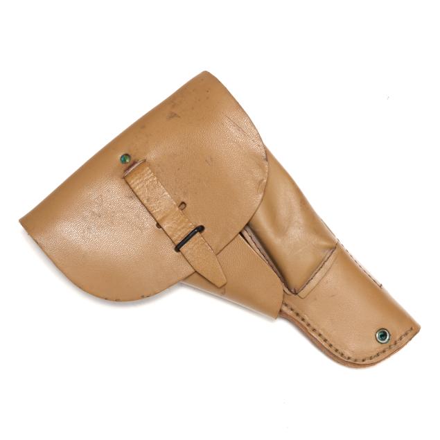 Overall fair estate condition, bluing intact throughout over roughly finished metal work showing tooling marks and with light to moderately severe pitting, grip scale checkering pattern clearly defined and lacking yet lacking some texture, holster leather in good condition with some green oxide present around assembly rivets.