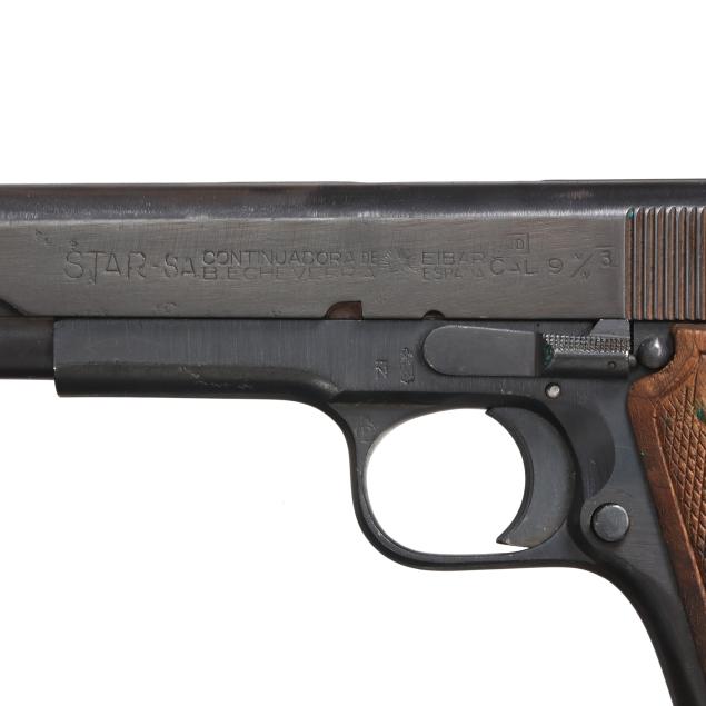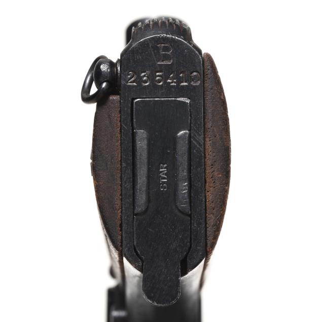 Serial number 235410 present on bottom of semi-automatic action frame, model designation B present adjacent to serial number, maker proof marks present around trigger guard area on left side and rear end of slide, text of STAR-SA.CONTINUADORA DE B. ECHEVERRA EIBAR ESPANA CAL. 9 M/M present on left side of slide with fixed front sight blade and dovetail rear sight, manual thumb safety, external hammer with half-cock, detachable magazine with text STAR present on floor plate, lanyard loop, checkered wood grip scales, light brown leather holster.