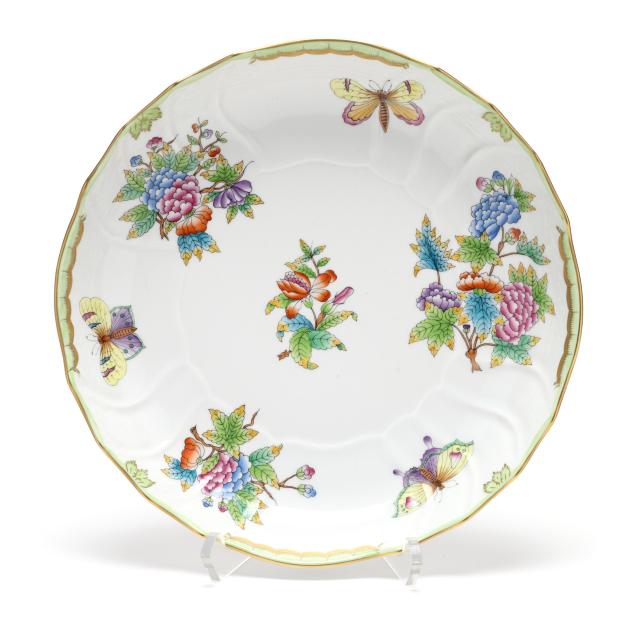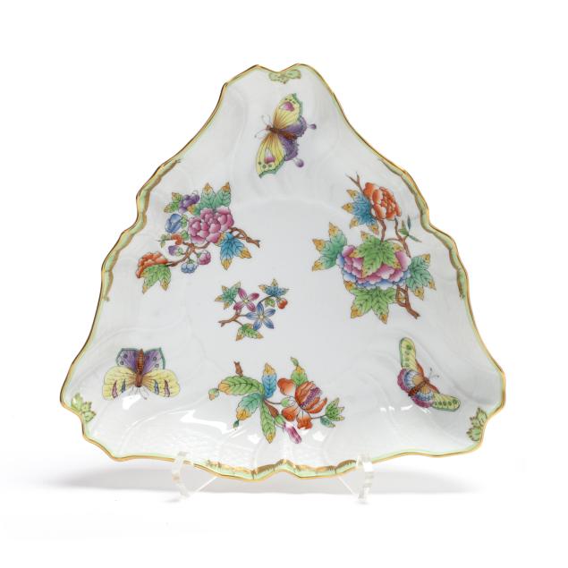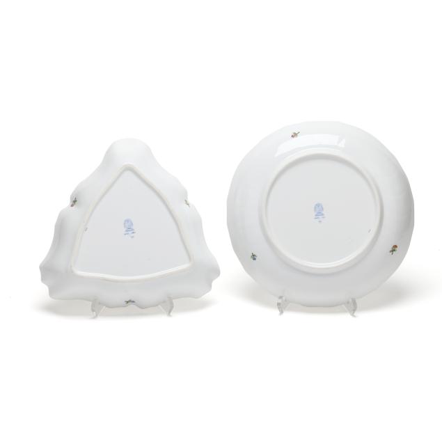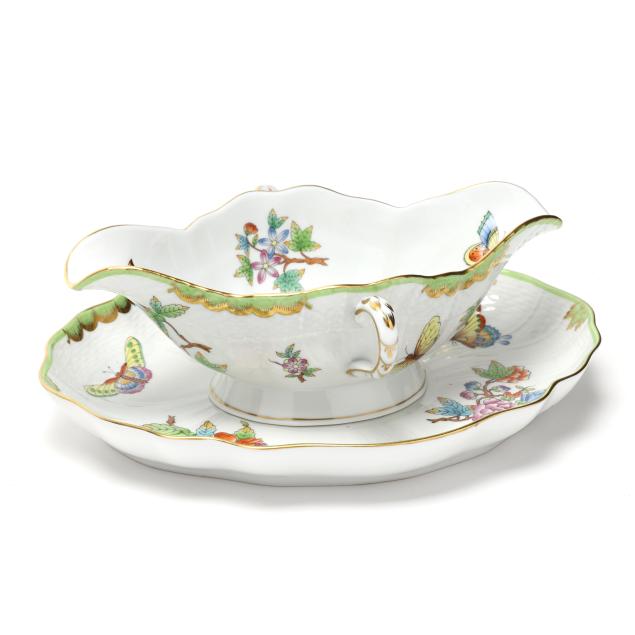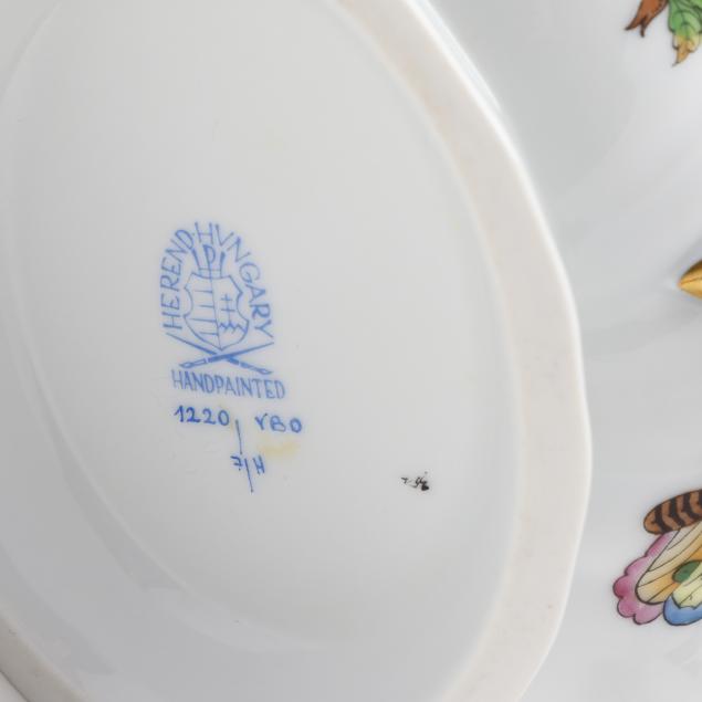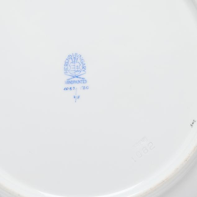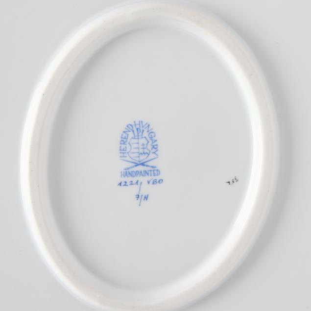 Hungary, hand-painted and gilt porcelain, (4) pieces to include a triangular vegetable bowl #1191 (10 in.); a round vegetable bowl #1082 (10 5/8 in.); and a gravy boat #1220 and undertray #1221 (boat 9 1/4 in., tray 10 3/8 in.), all with company backstamp to underside.