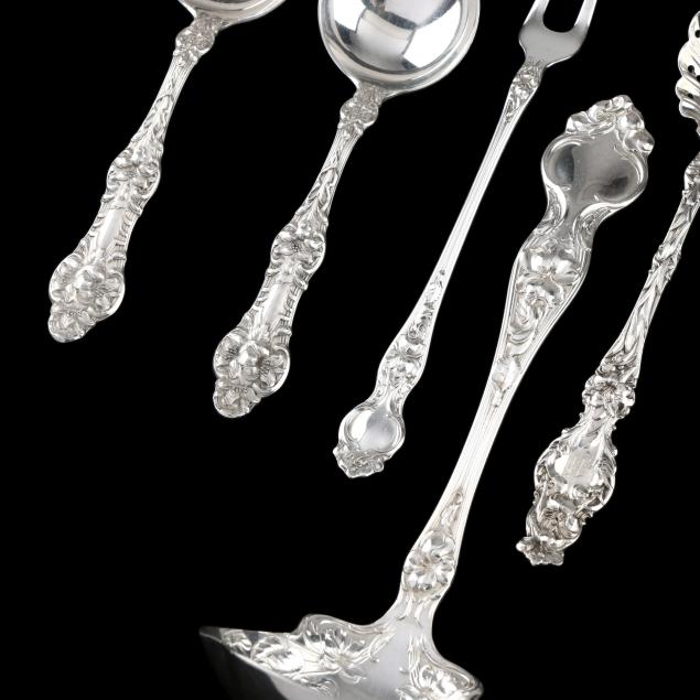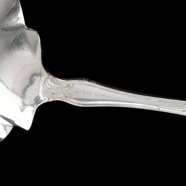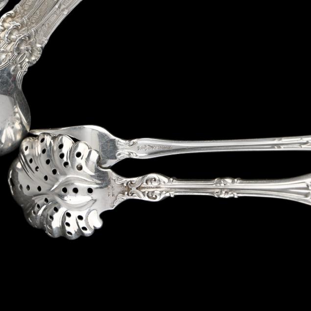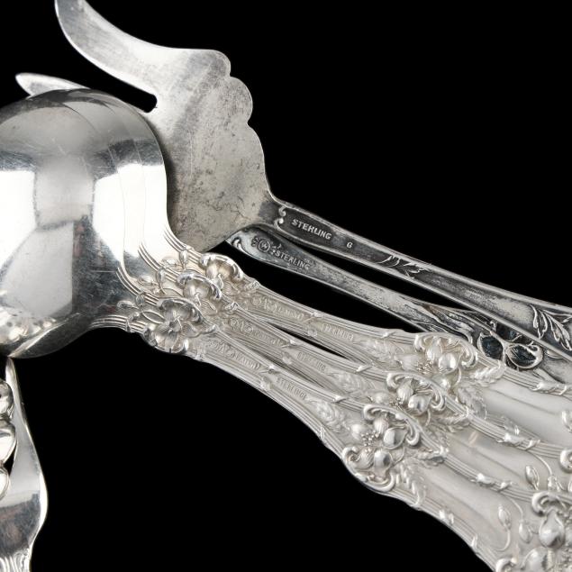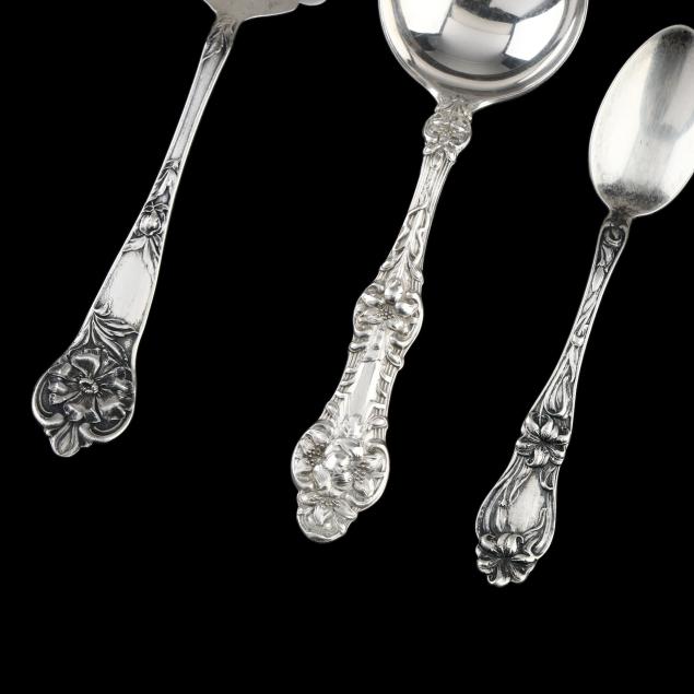 Lily olive spoon, monogrammed; a Whiting sardine fork; and a demitasse spoon marked "Sterling" in similar patterns.