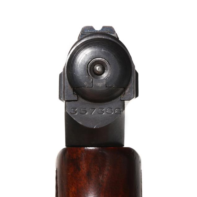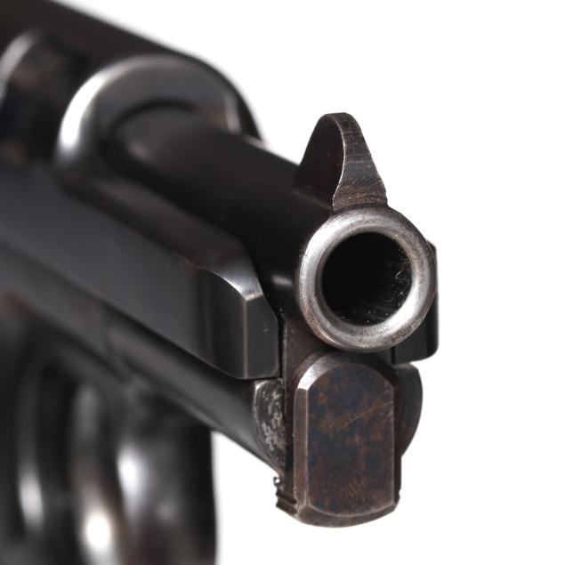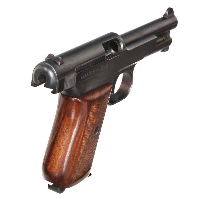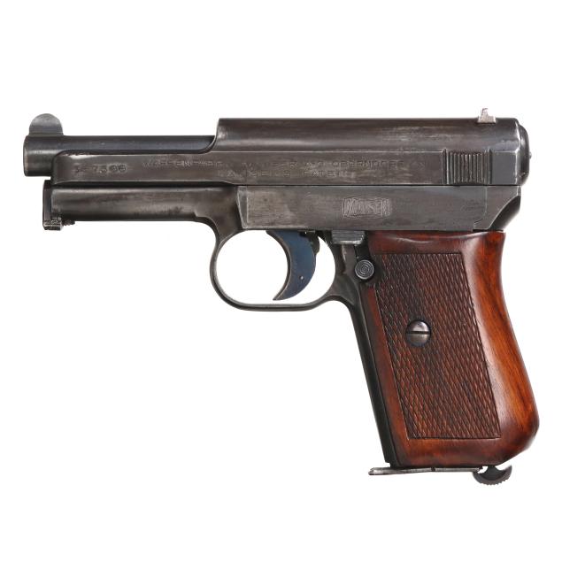 Serial number 357366 present on blued semi-automatic action slide, partial serial number 7366 present on frame inside trigger guard, text of WAFFENBRIK MAUSER A-G. OBERNDORF A.N. MAUSER'S PATENT and MAUSER insignia present on left side of slide, text of MAUSER 7.65 present on right side of slide, text of GERMANY present on right side of frame, manual safety, dovetail rear sight, fixed blade front sight, one detachable magazine, one piece checkered wood grip.