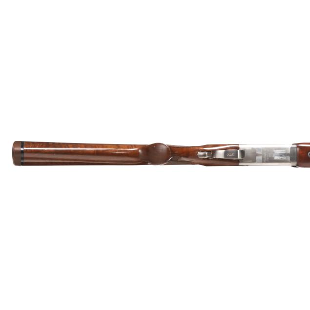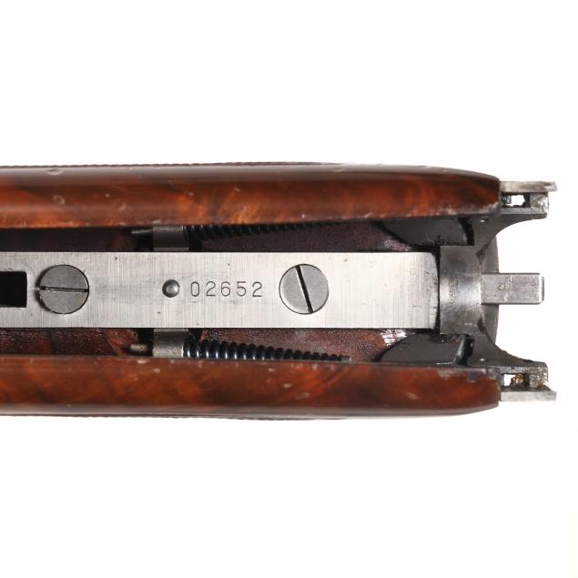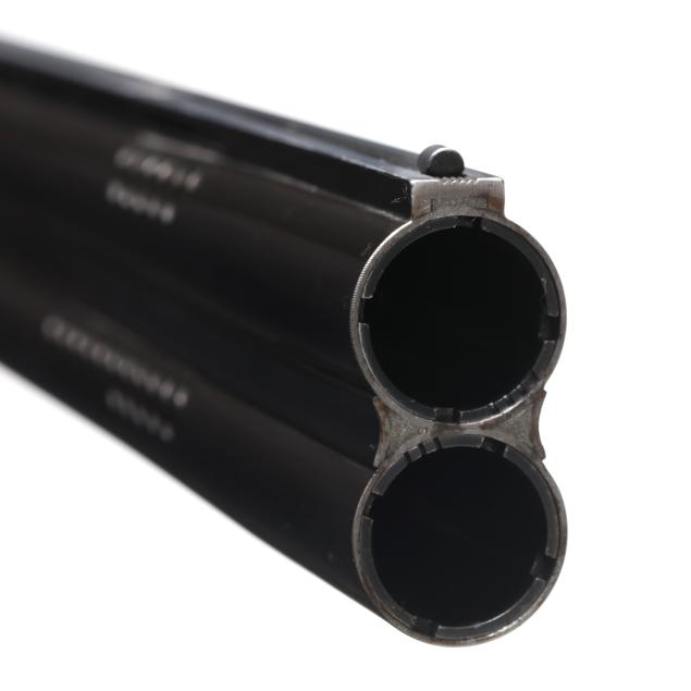 Overall good estate condition, barrel bluing is dark with higher polished sheen, faint scattered scratches present on the blued finish, bores are bright and shiny, barrel porting professionally executed, light to moderate stock finish damage most notably found along top right edge of forend and near recoil pad, other faint scuffs and field marks throughout, checkering is clean and dry, recoil pad is not well fit to the gun.