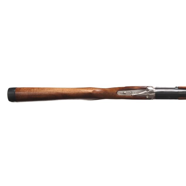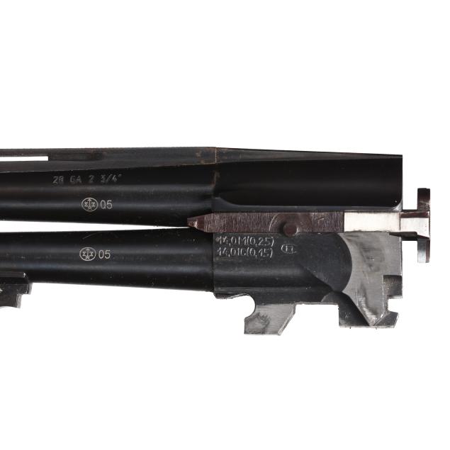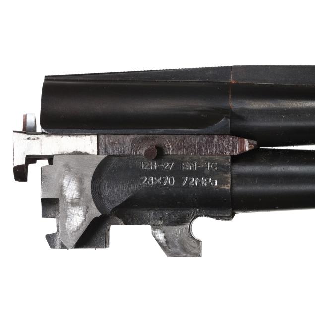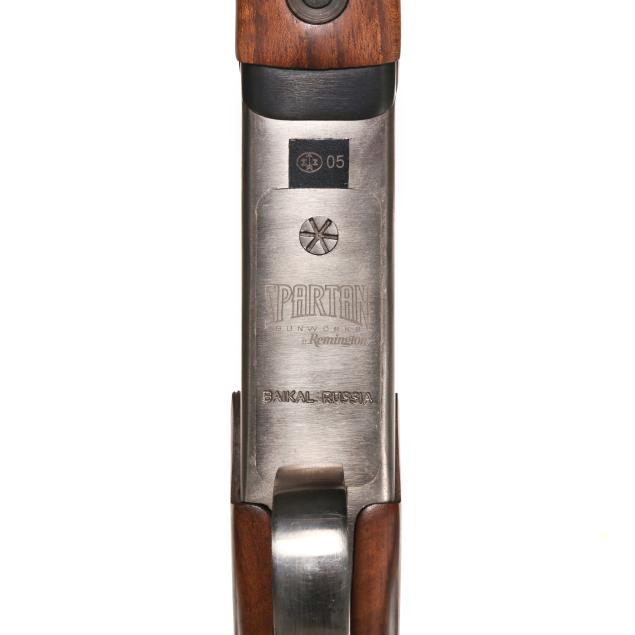 Serial number 052792714R present on silver colored O/U receiver, text of SPARTAN GUNWORKS BY REMINGTON BAIKAL RUSSIA and SPR 310 present on receiver, text of 28ga 2 3/4 and SPARTAN, SHARPES FL present on 26 1/2 in. vent rib steel barrel with matted top rib and sing bead, ejectors, single non-selective trigger, manual safety, stained and checkered wood stock and forend, factory recoil pad.