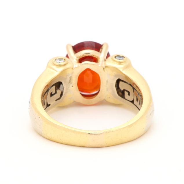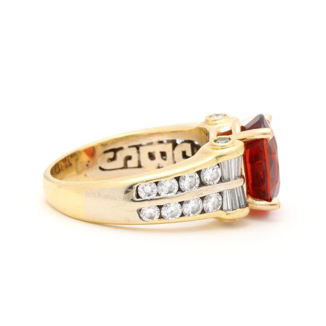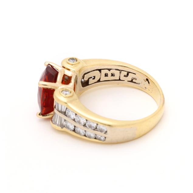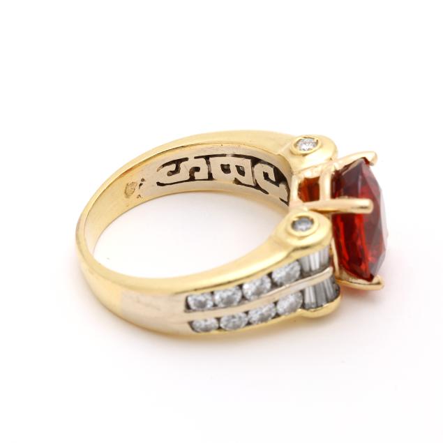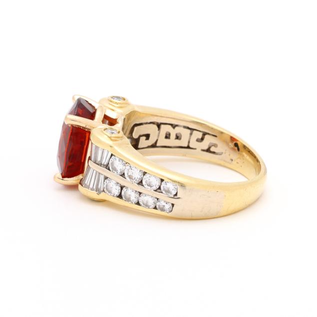 Centered on an oval cut spessartine garnet (11.16 x 9.20 x 6.00mm) weighing approximately 4.34 carats, and set to the shoulders with tapered baguette cut and full cut round diamonds weighing approximately 2.00 total carats (I-J color, VS2-SI1 clarity), the inside shank with carved initials JBS, testing 14KT.