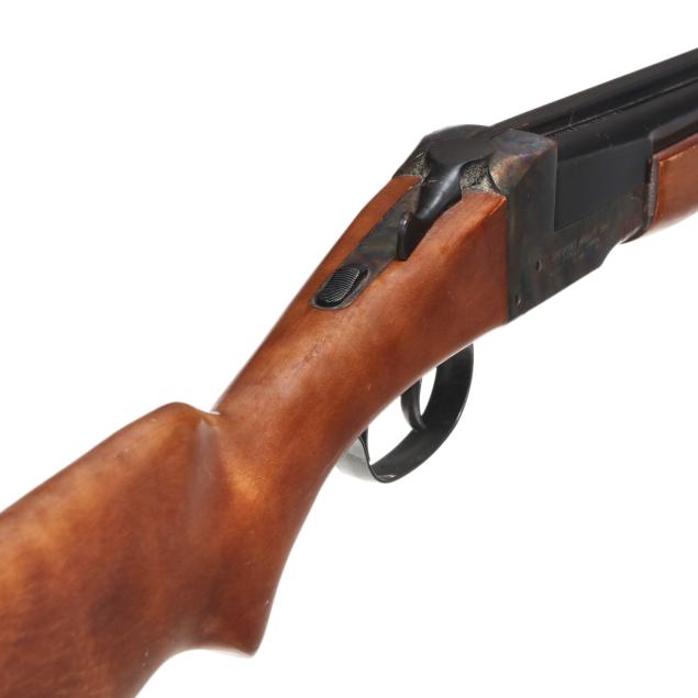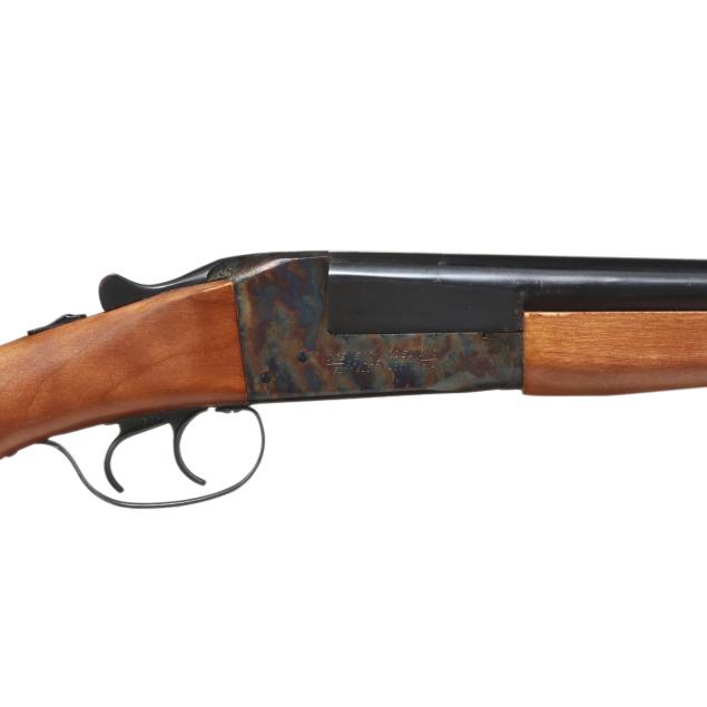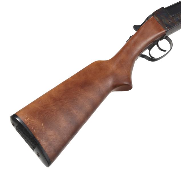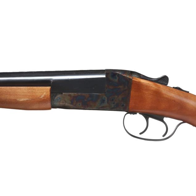 No visible serial number (NVS), text of STEVENS MODEL 311C SAVAGE ARMS WESTFIELD. MASS. U.S.A. present on right side of cyanide color cased boxlock action receiver, text of SELECTED FORGED STEEL and PROOF TESTED .410 BORE 3 INCH CHAMBER present on 26 in. barrel, double triggers, automatic safety, plain wood buttstock and forend, factory buttplate.