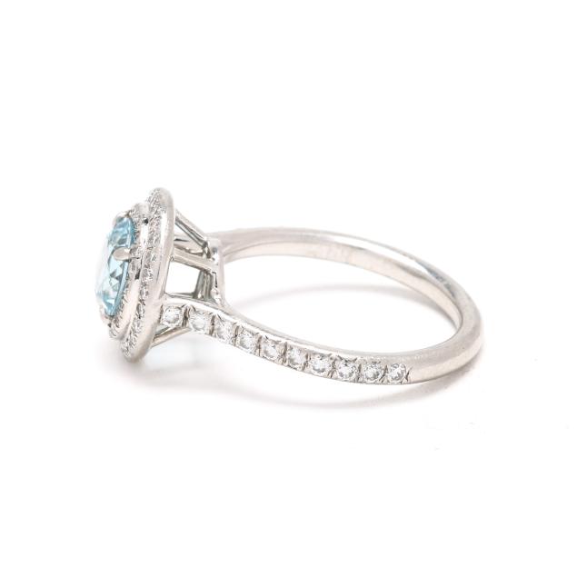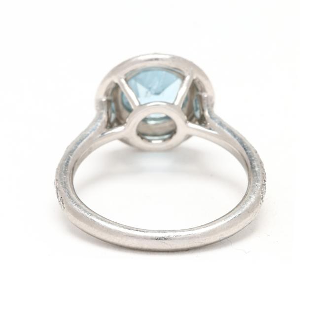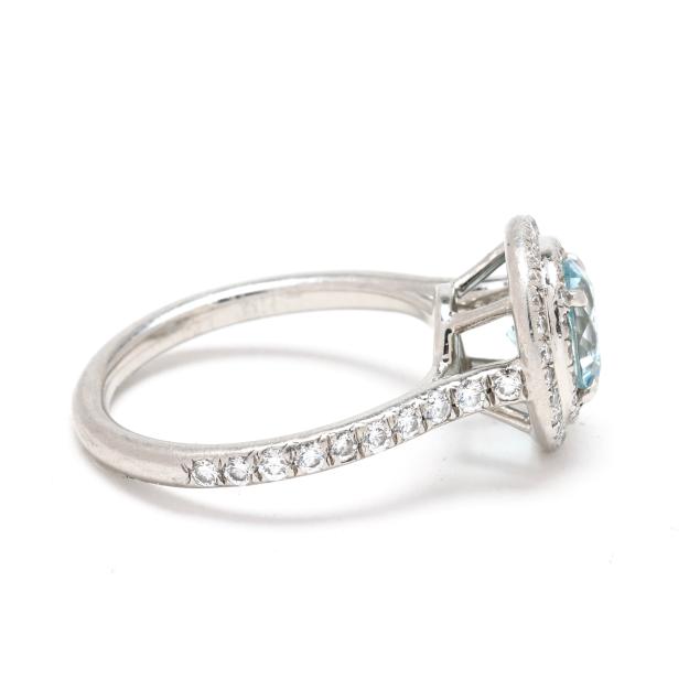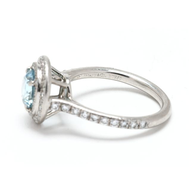 Centered on a round cut aquamarine (6.45 - 6.41 x 4.25mm) weighing approximately .90 carat, set within a double halo of full cut round diamonds and set with full cut round diamonds to the shoulders, stamped Tiffany & Co. PT950. The total diamond weight is approximately .52 total carat (G-H color, VS2-SI1 clarity).