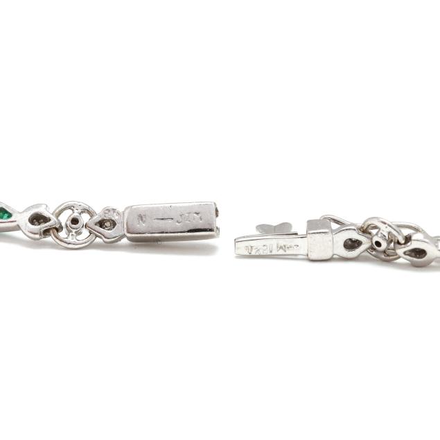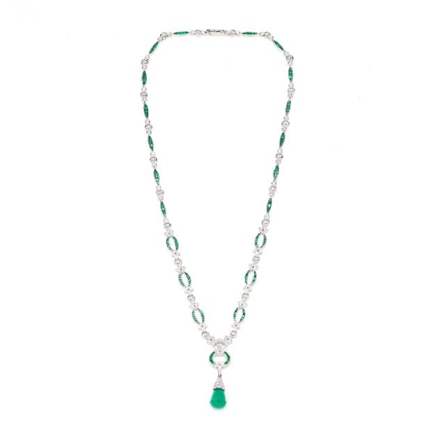White gold necklace with repeating garland and floral motifs set with square cut emeralds and full cut round diamond melee, suspending a fixed pendant with a briolette emerald drop with a diamond set cap, completed with a box clasp with figure eight safety, stamped AM 1821 and N - JIM, testing 18KT.