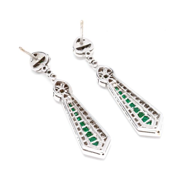 Art Deco style earrings with rosette motif surmount suspending an elongated shield form drop, set with square cut and round cut emeralds weighing approximately .82 total carat and with full cut round diamonds weighing approximately .60 total carat (G-H color, VS2-SI1 clarity), completed with posts, testing 18KT.