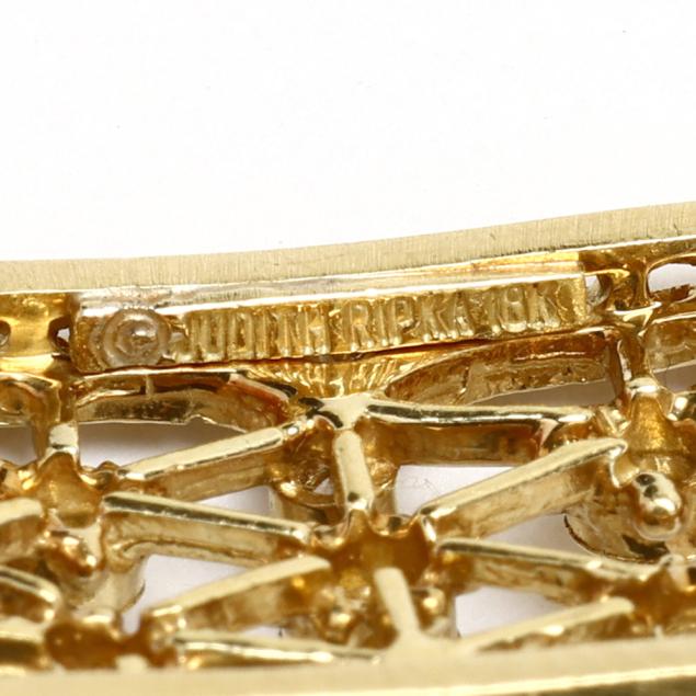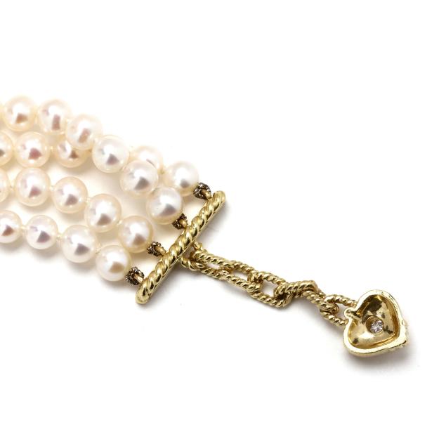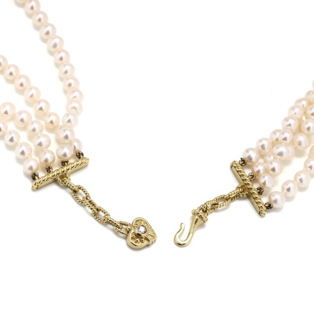 Multi-strand pearl choker with four strands of off-round cultured pearls (4.5mm to 5.mm), the center with a gold lattice motif element and set with two gold bar stations, all set with full cut round diamonds weighing approximately 1.0 total carat (H-I color, VS2-SI1 clarity), completed with a rope twist design hook and eye clasp, signed and stamped 18K.