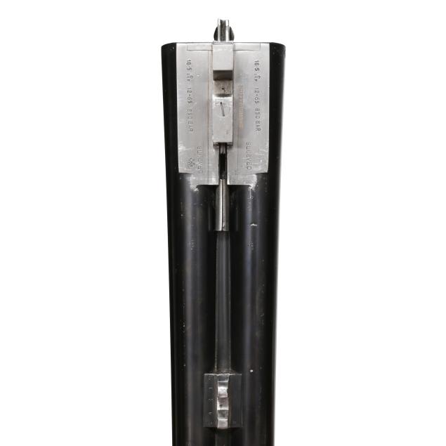 Overall very good estate condition, barrel bluing is excellent, bores are shiny, barrels ring with clear church bell tone, barrel to action fit is tight, coined patina engraved receiver is clean and unworn, stock finish is intact with scattered moderate field marks throughout, drop points slightly worn while clearly present, very fine lines per inch and mullered border flat top checking pattern with small sections filled with old gun oil, lined horn buttplate is devoid of worm holes or cracking and remains healthy.
