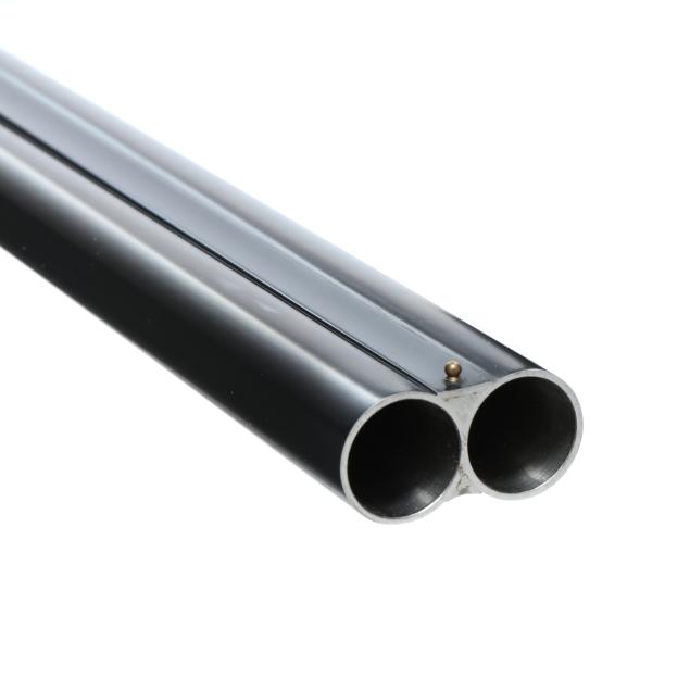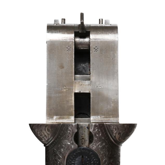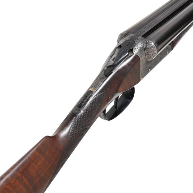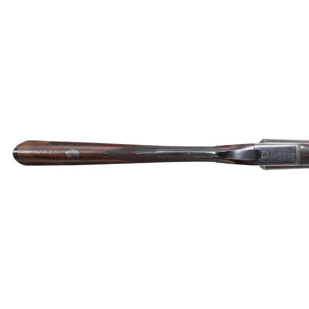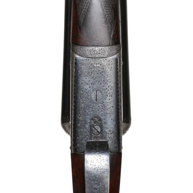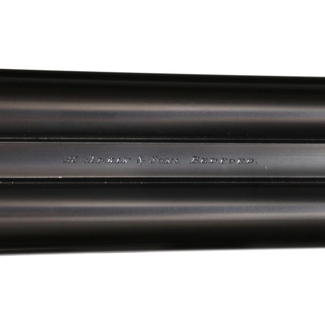 No visible serial number (NVS) present, text of H. ADKIN & SONS BEDFORD present on smooth top rib with single front bead, 28 in. sleeved fluid steel barrels, 100% coverage rose and scroll engraving over silver coined patina receiver, double triggers, ejectors, automatic safety, straight grip flat top checkered walnut buttstock with stock oval inlay along toe line, checkered splinter walnut forend, lined horn buttplate.