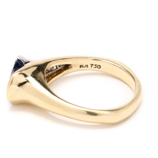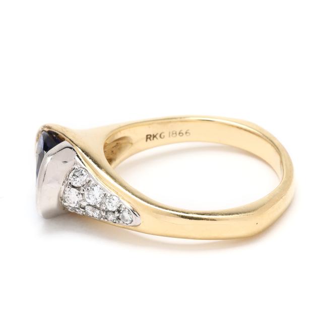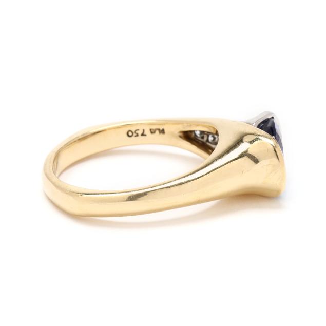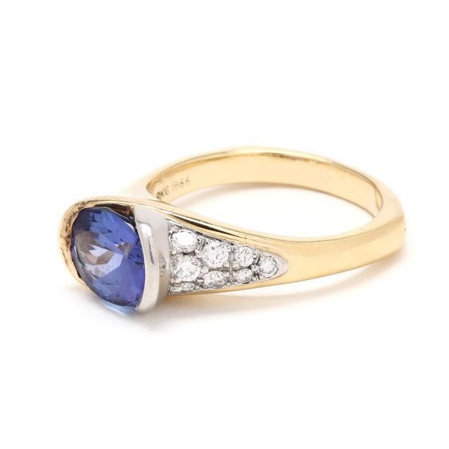 Centered on a horizonatlly set oval cut tanzanite (9.5 x 8mm), the bypass setting with one side in platinum and set with full cut round diamond melee, stamped with maker's mark RKG1866 and Plat 750.