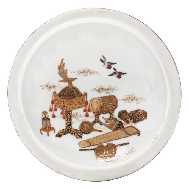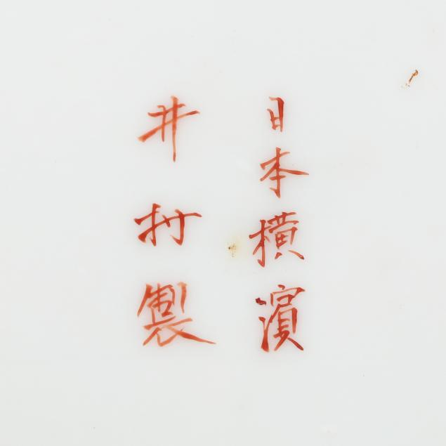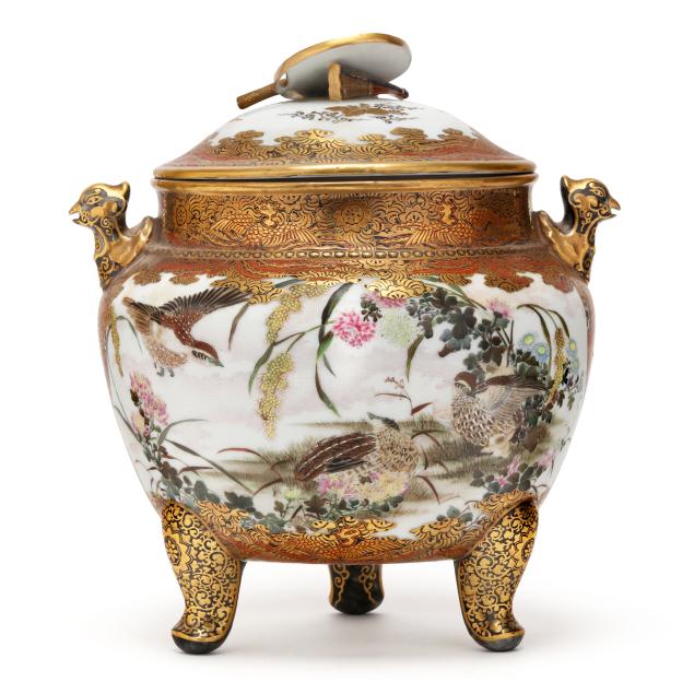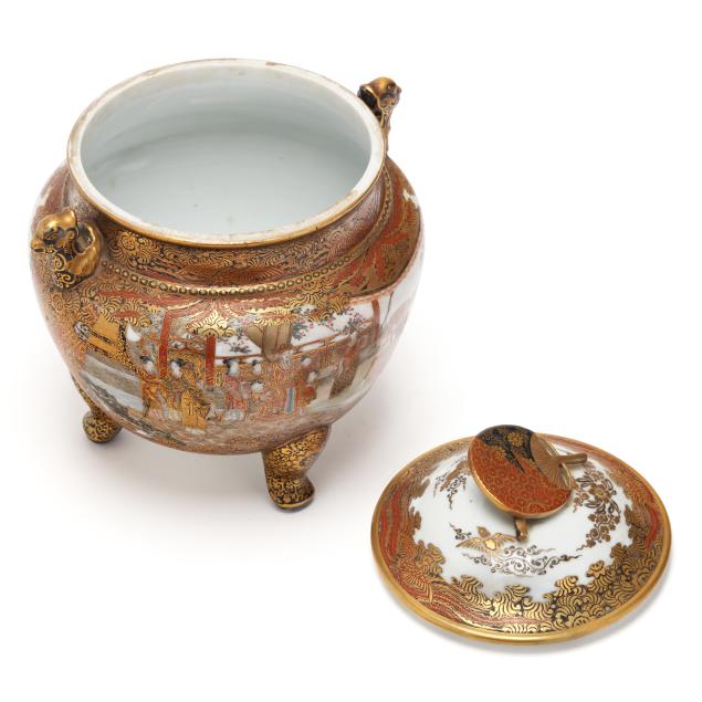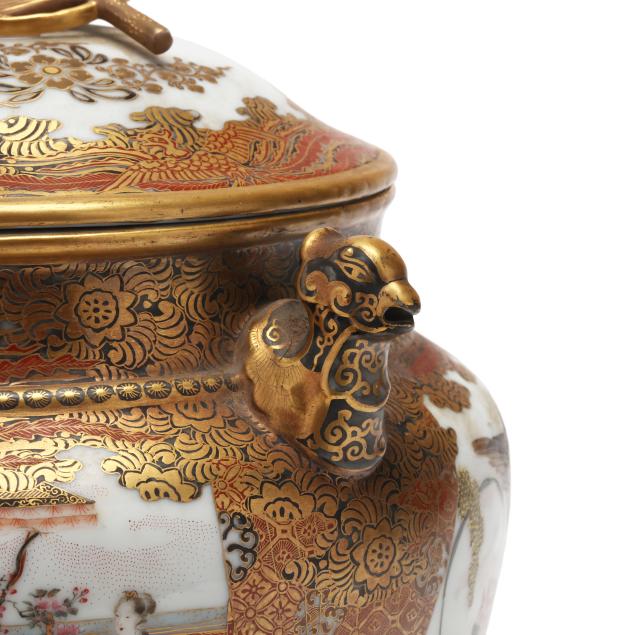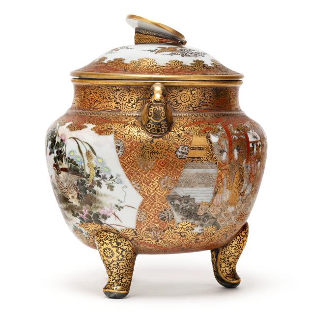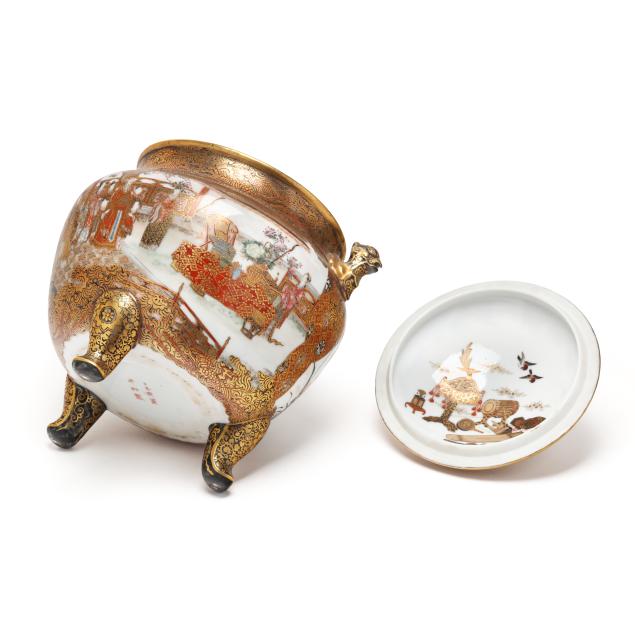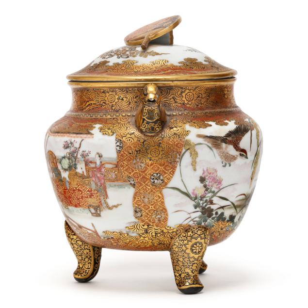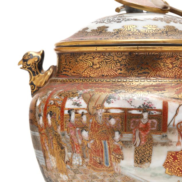 Meiji period (1868-1912), porcelain hand painted in polychrome enamels and gold, the body decorated on one side with a gathering of Chinese nobility in a lavish villa with graceful peony blossoms and the other side with a serene landscape of birds and flowers, the body is flanked by black and gold phoenix head handles and raised up on three similarly patterned feet, the fitted cover is surmounted with two fans, the underside of the cover painted with Japanese symbols, ornate gold and iron red borders cover the remainder of the vessel and cover, signed to the underside in iron red 日本横濱井村製 (made by Imura in Yokohama Japan).