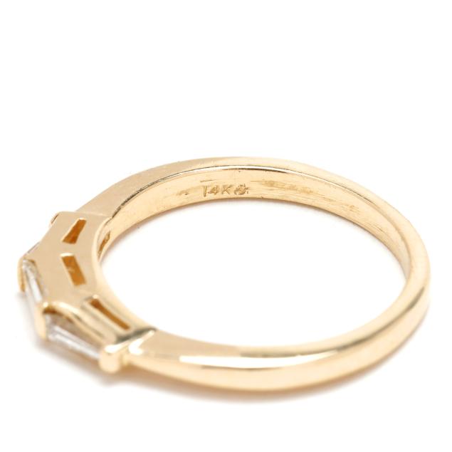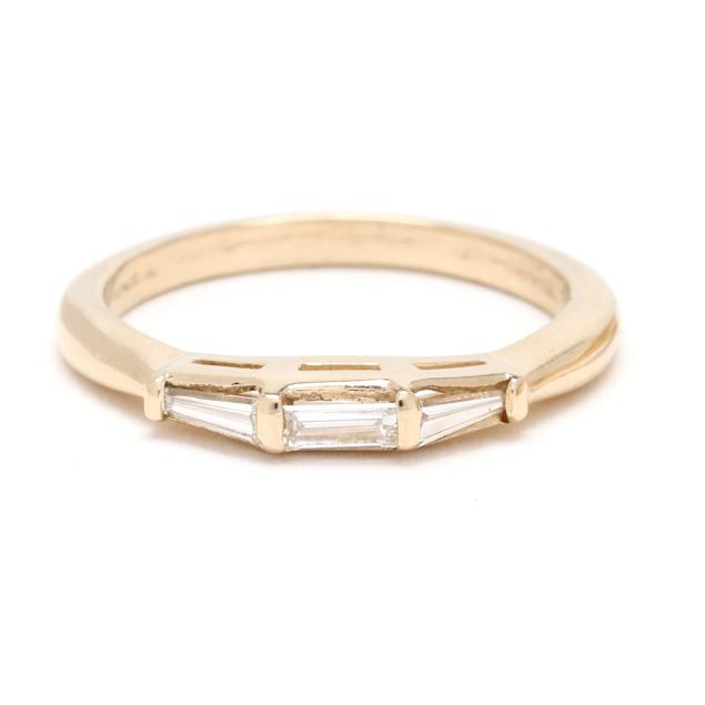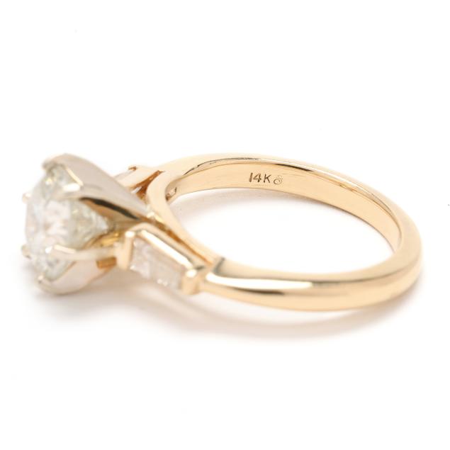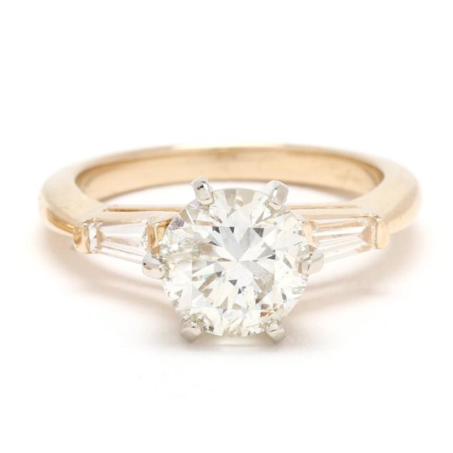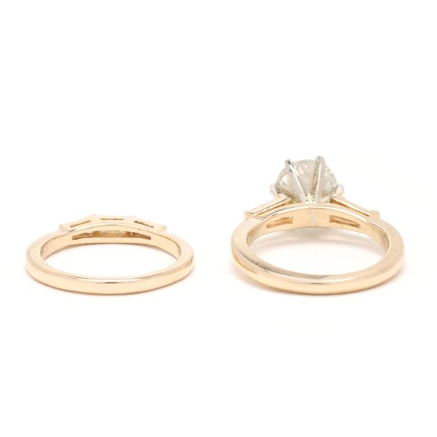 centered on a round brilliant cut diamond (8.00 - 8.09 x 5.26mm) weighing 2.11 carats (actual) (L color, I2 clarity) and set to each shoulder with a tapered baguette cut diamond weighing approximately .25 total carat (H-I color, VS1 clarity), stamped 14K and with a maker's mark, with a matching band set with straight and tapered baguette cut diamonds weighing approximately .25 total carat (H-I color, VS1 clarity), stamped 14K and with a maker's mark.