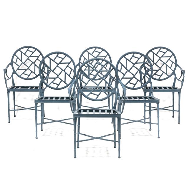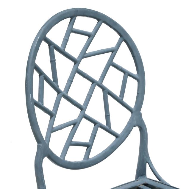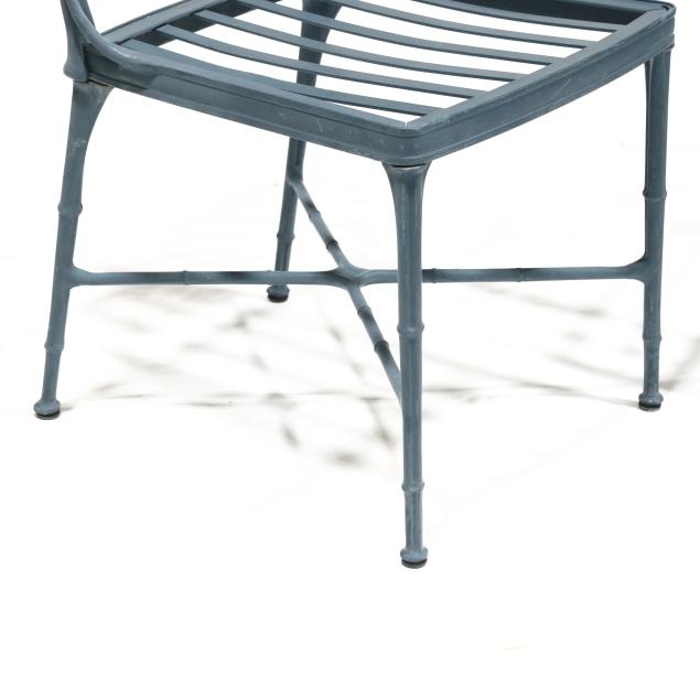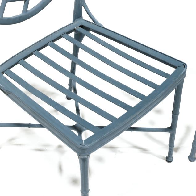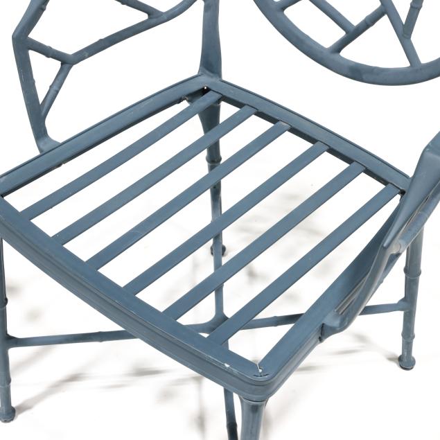 Late 20th century, green painted aluminum, including a circular table with glass top (29.5 x 48 in. diameter), pair of armchairs (36 x 23 x 23 in.), appears unmarked.