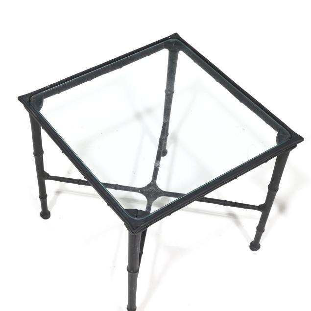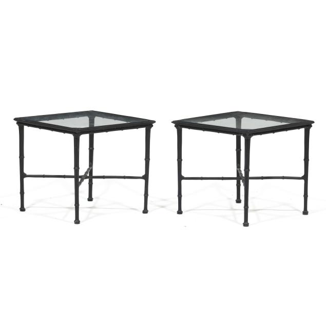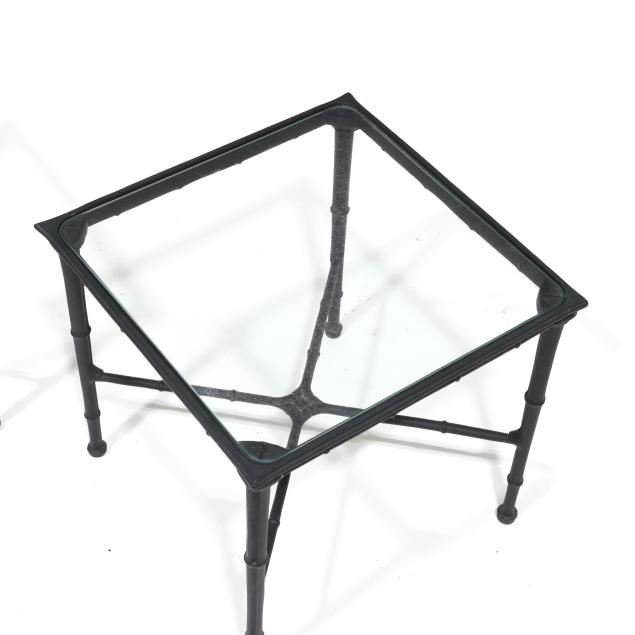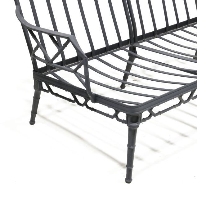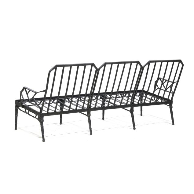 Late 20th century, black painted aluminum, including a triple back sofa (32 x 76 x 29 in.); a double back settee (32 x 48 x 26 in.); and a pair of glass top side tables (16 x 17 x 17 in.), appears unmarked.