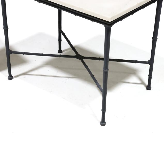 Late 20th century, black painted aluminum, white marble top, cross stretcher base, faux bamboo legs, appears unmarked.