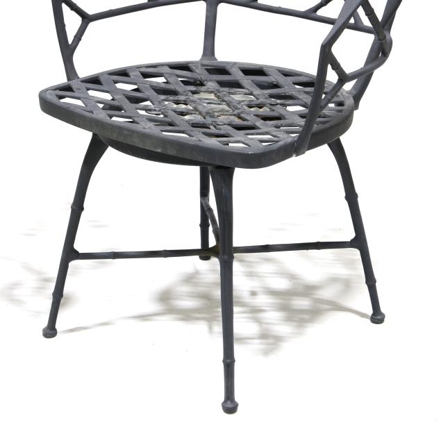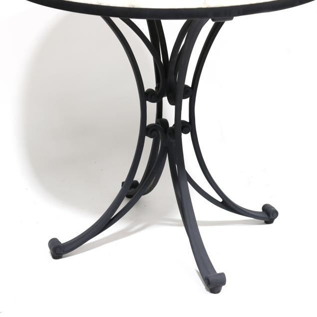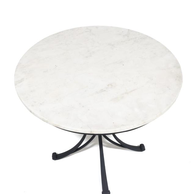 Late 20th century, black painted aluminum, including a pair of swivel armchairs (32 x 24 x 20 in.); and an associated marble top circular table (28 x 31.5 in. diameter), appears unmarked.
