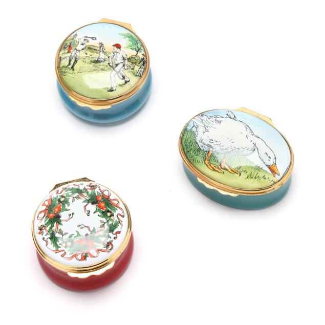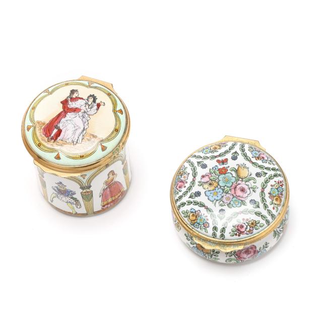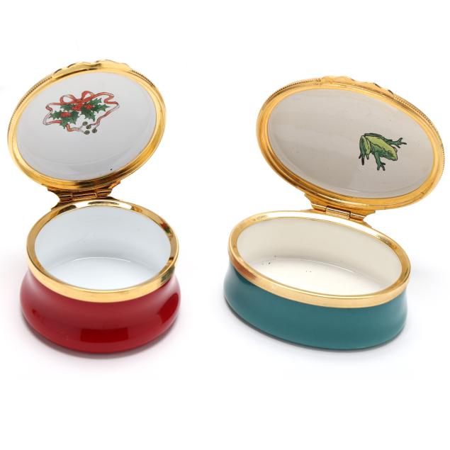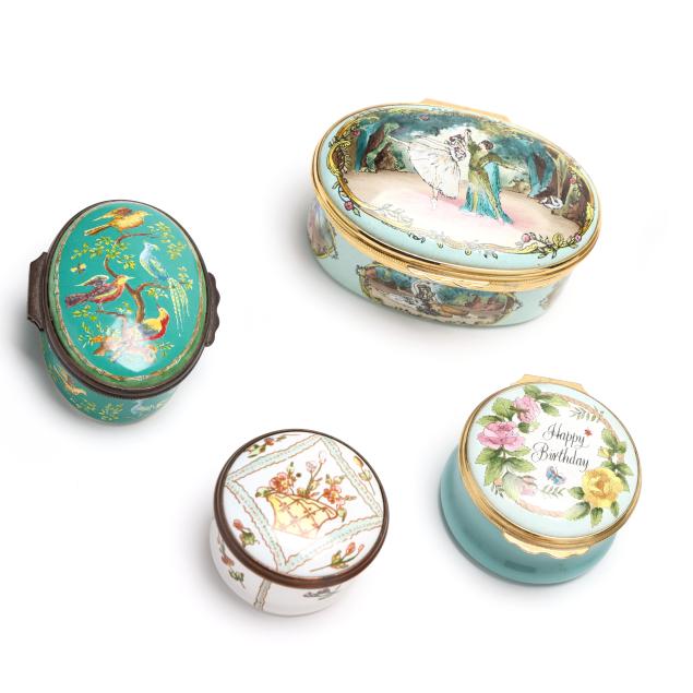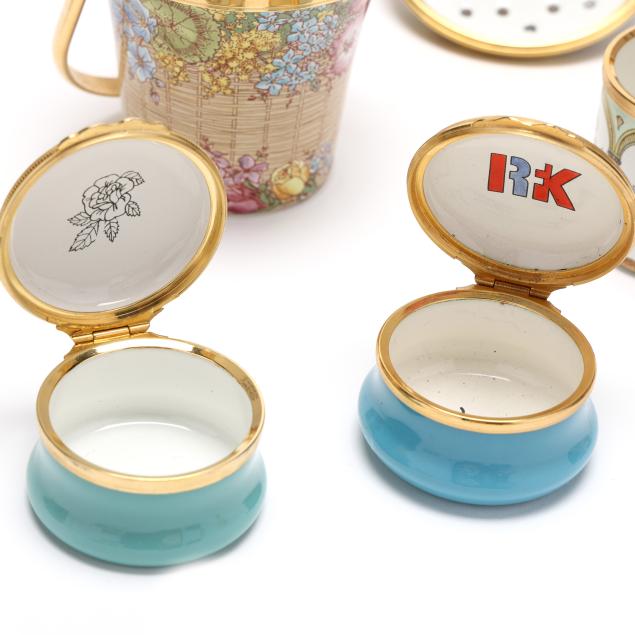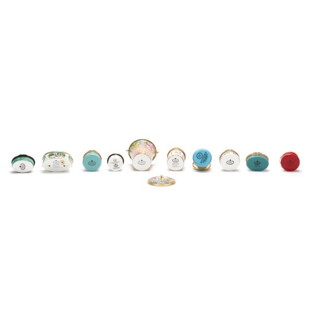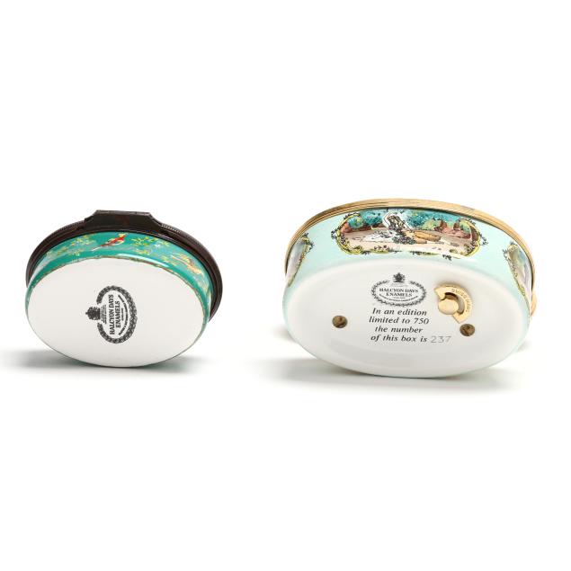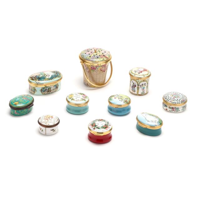 Mid- to late 20th century, (10) enamel boxes to include (9) by Halcyon Days Enamels, including (2) limited edition boxes: one to honor the Sadler's Musick House Tercentenary #270/750; and a music box playing the overture to Mendelssohn's