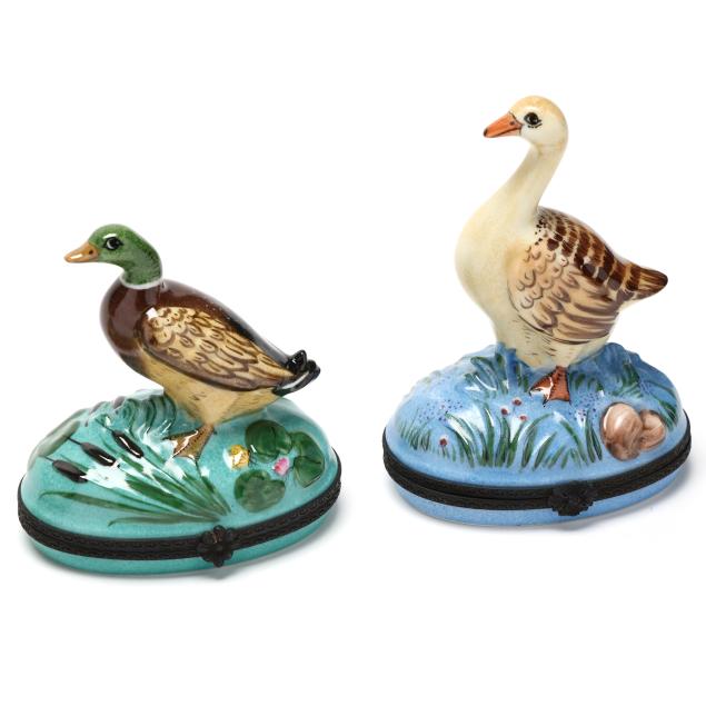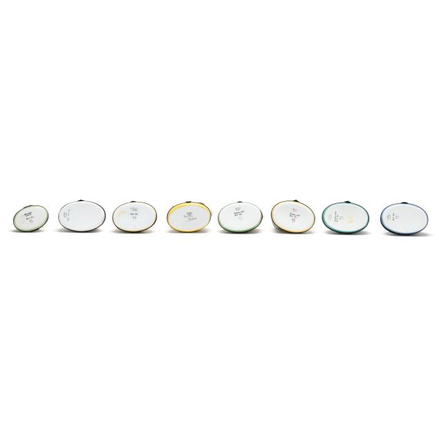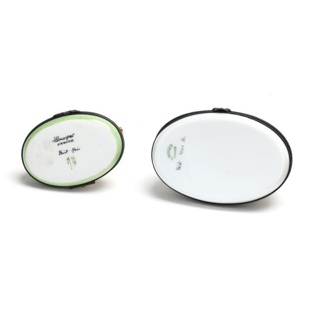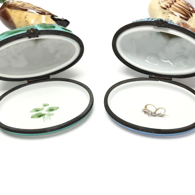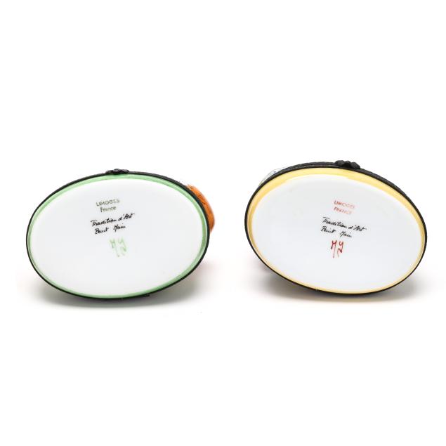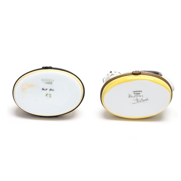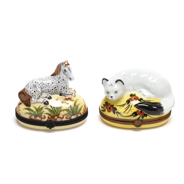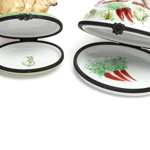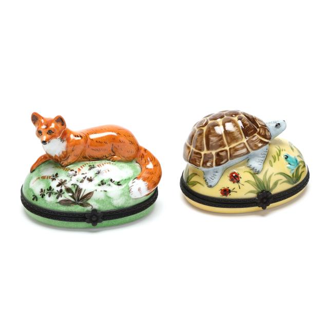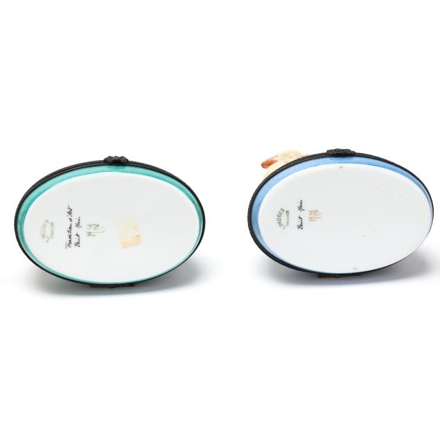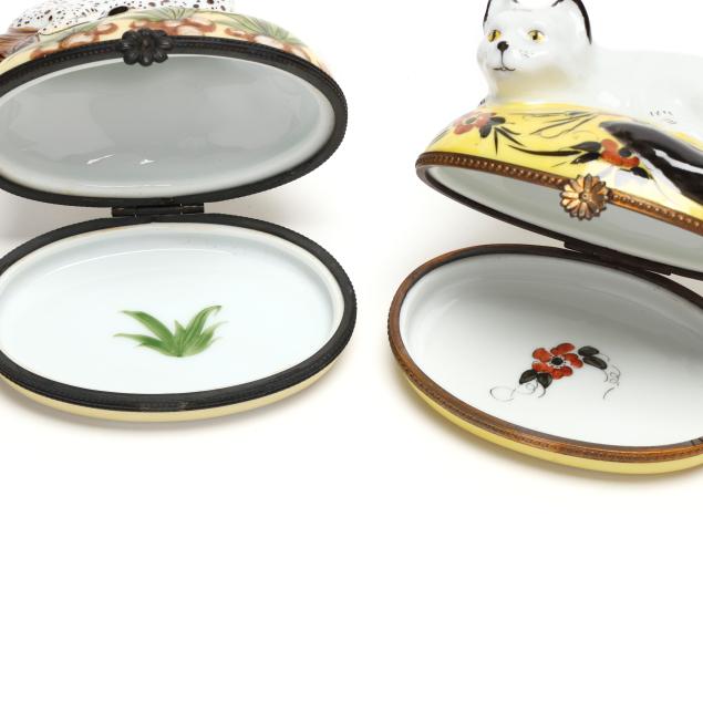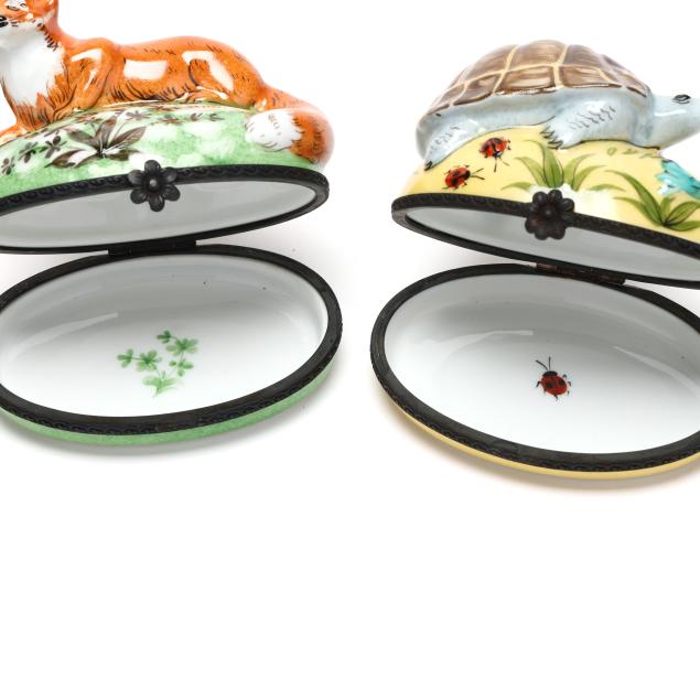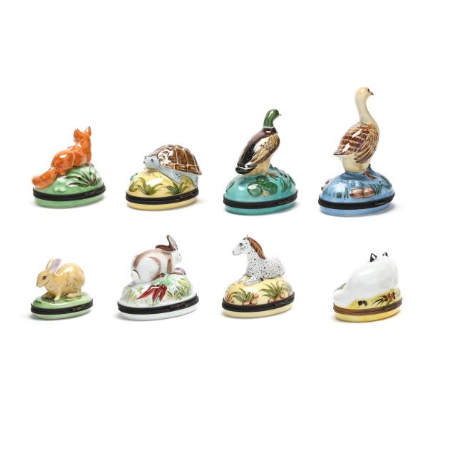 France, mid- to late 20th century, (8) hand-painted porcelain pill boxes in animal forms; all marked with artist's signature and "Limoges France" to underside.