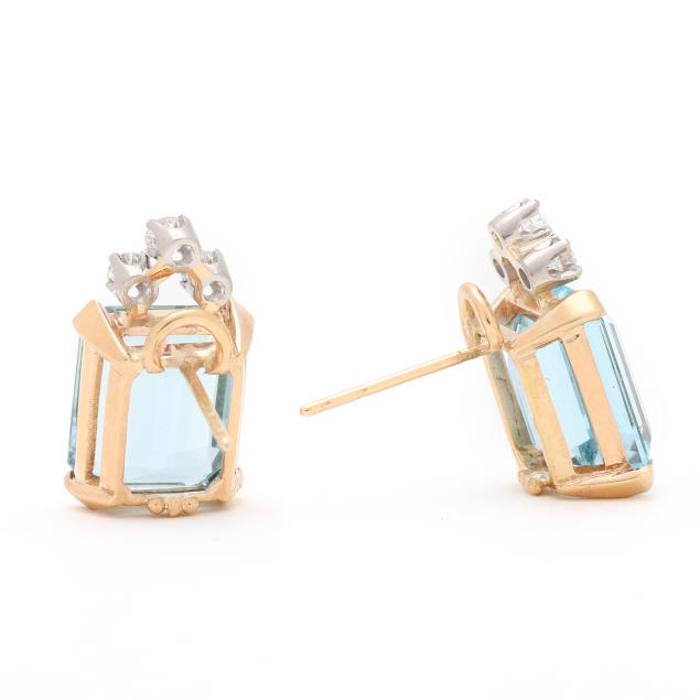 The gold stud earrings set with an emerald cut aquamarine (12 x 10mm) weighing approximately 10.0 total carats, surmounted by full cut round diamonds weighing approximately .36 total carat (H-I color, SI1-SI2 clarity), completed with post, testing 14KT.