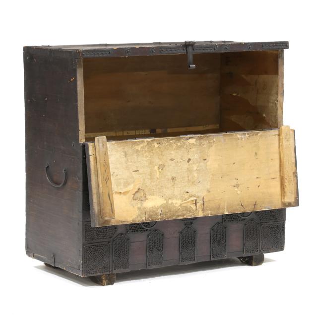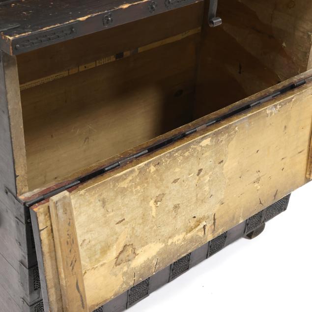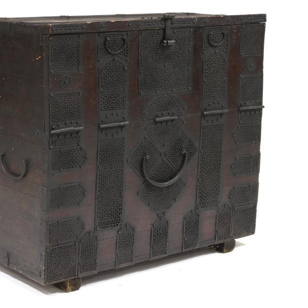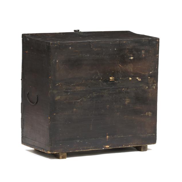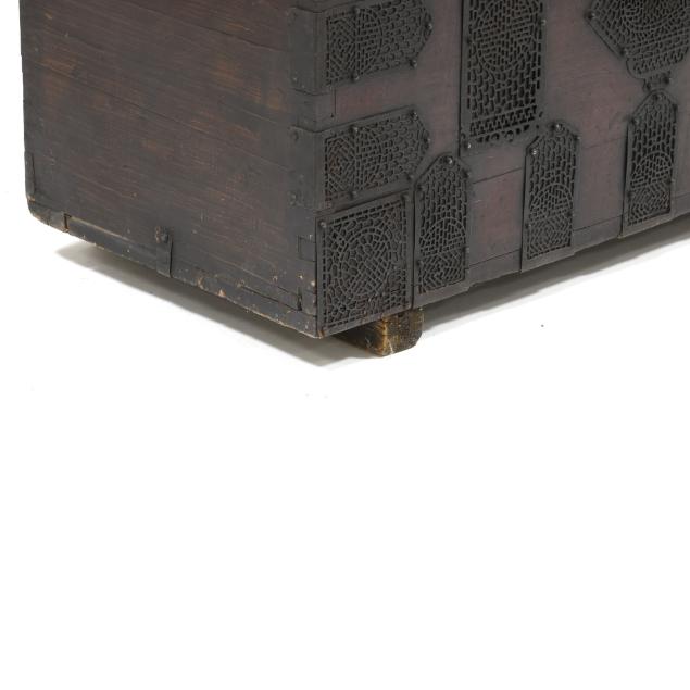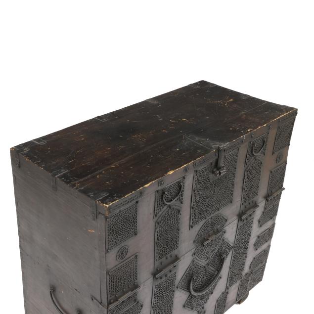 Bandaji, the chest is distinctive in the densely ironwork hardware with finely pierced lace-like design that covers a large portion of the frontal surface. “Sung Sun” is an onomatopoeic word in Korean that represents the sound the wind makes when blowing rapidly through a hole. Most likely made in the area now considered North Korea.