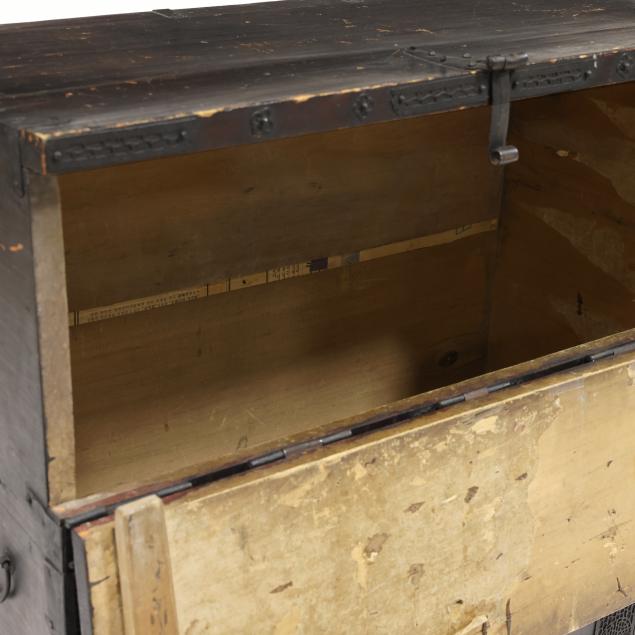 Consistent wear with age and travel; shrinkage cracks and scratches to lid; general wear and loss to paint surface especially to edges; wear and tears to interior.