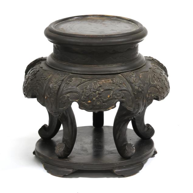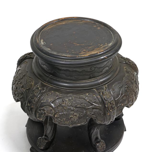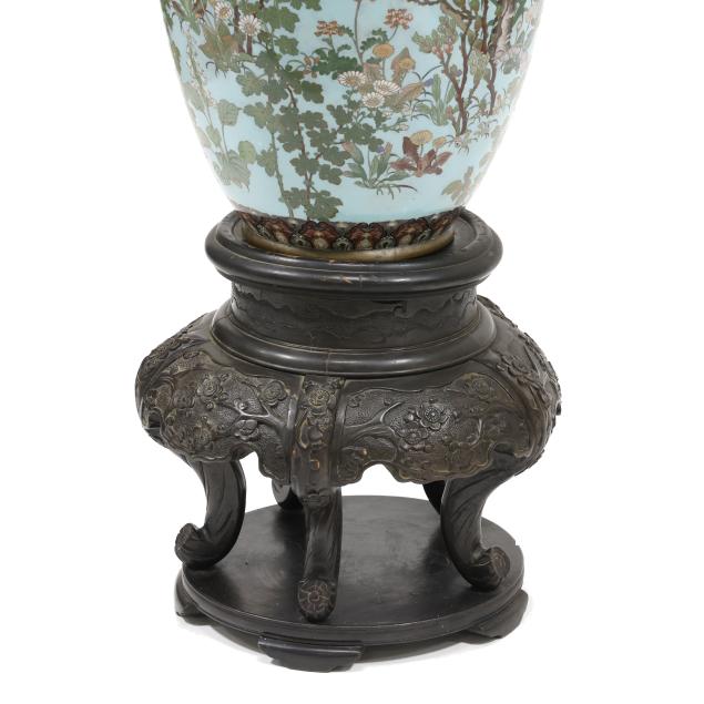 nashiji ground, there is a thick pattern band around the mouth rim repeated below above the foot rim, underside and interior of mouth have light blue enamel, presented raised on a carved wood stand.