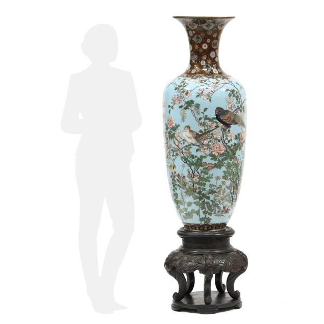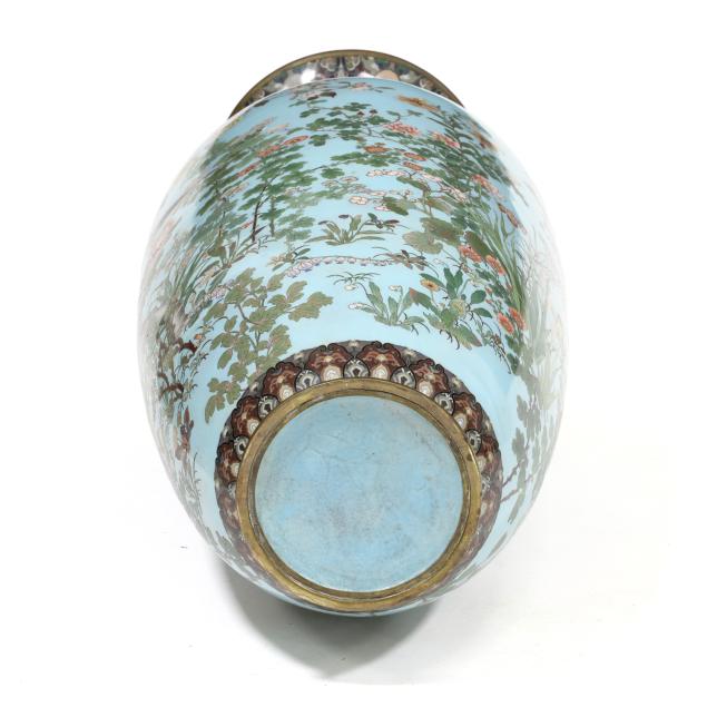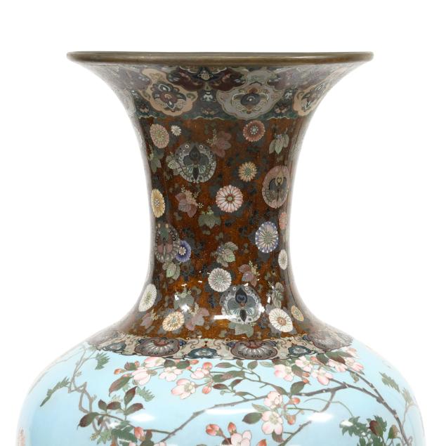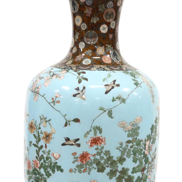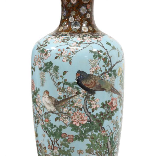 musen wireless technique, the main body features a pair of pheasants perched on branches of a cherry blossom tree they are surrounded by a lush garden with a myriad of blooming flora that includes wisteria, peony, chrysanthemum, hydrangea, iris and many more all against a light blue ground, the scene is continued around the entire vase, the elegant tapered neck is decorated with chrysanthemum and paulownia motifs in serene colors against a speckled amber