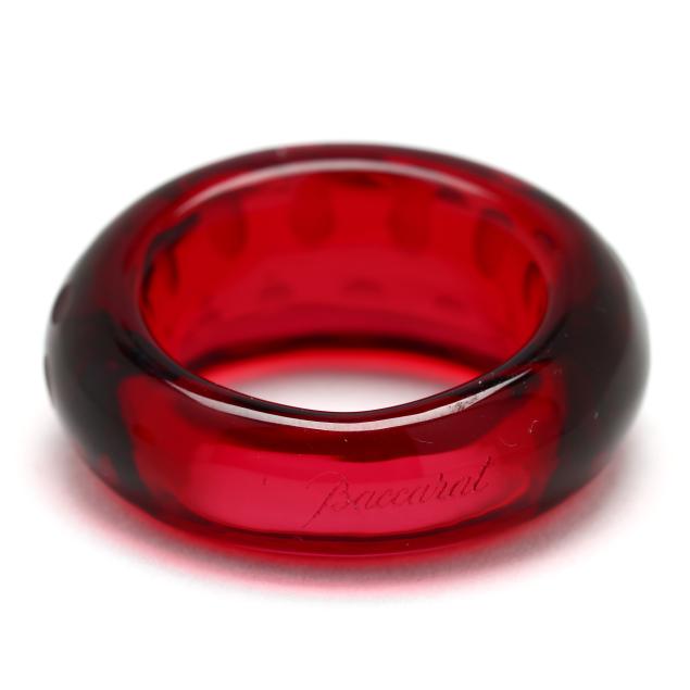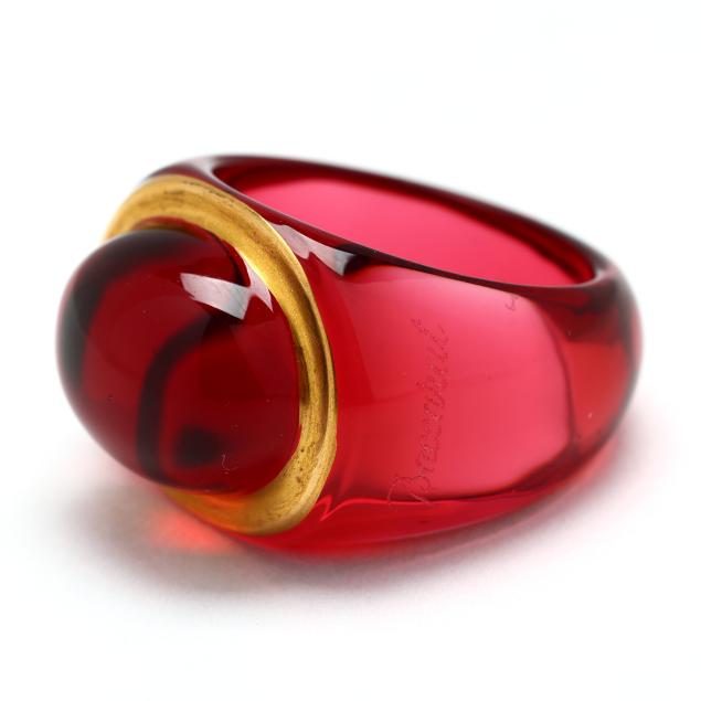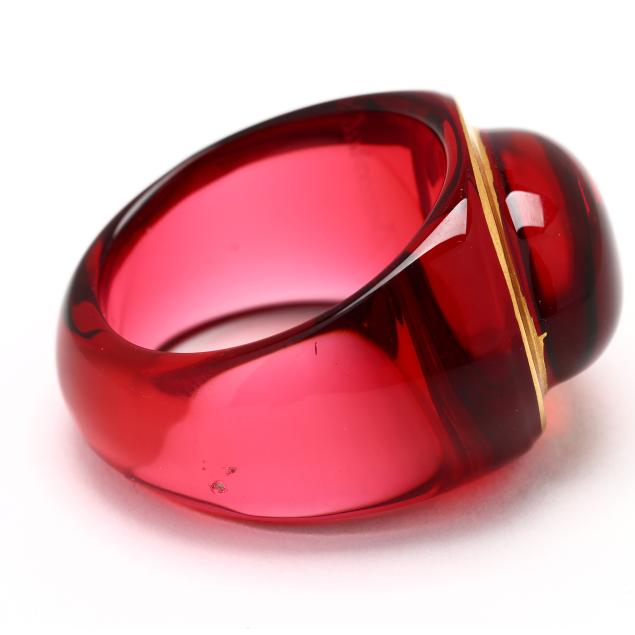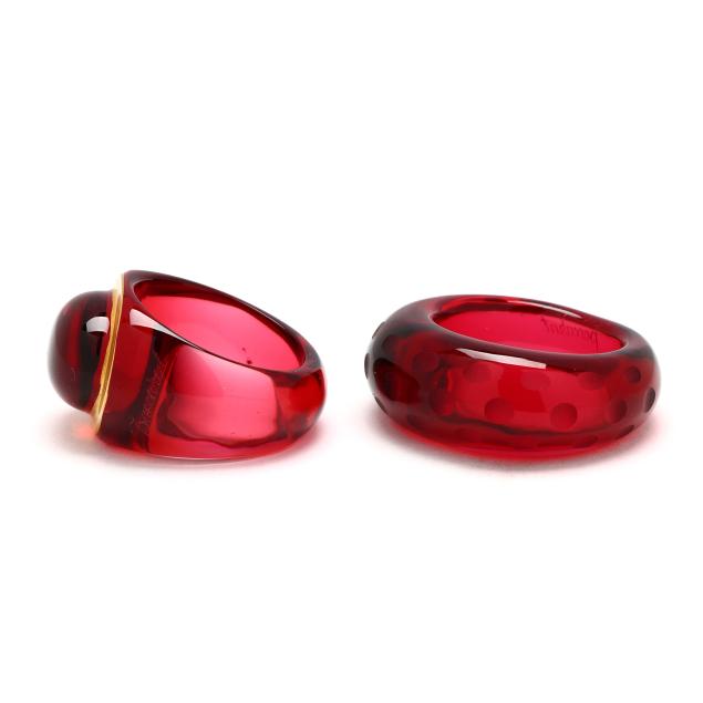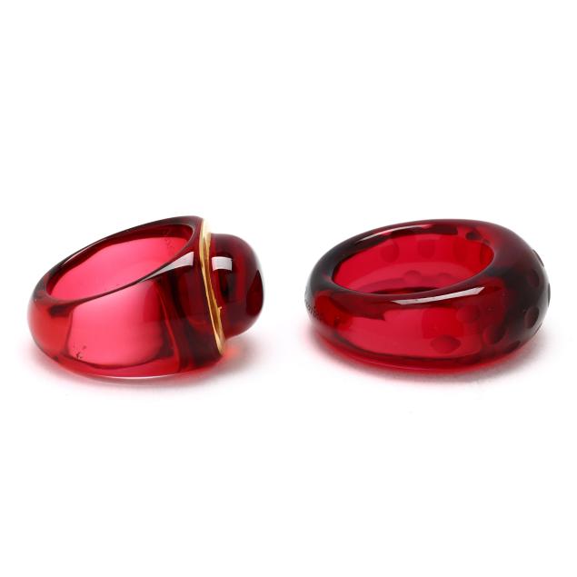 To include: a carved red crystal ring in the form of a signet ring, with gold-tone painted surround and signed (15 x 19mm; Ring size 6.5); and a carved red crystal band, domed with laser etched oval design and signed (11mm; Ring size 6.5).