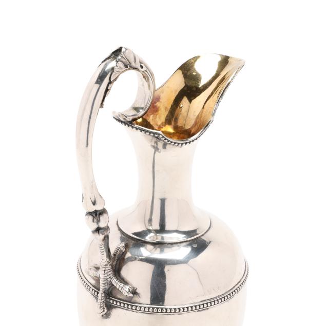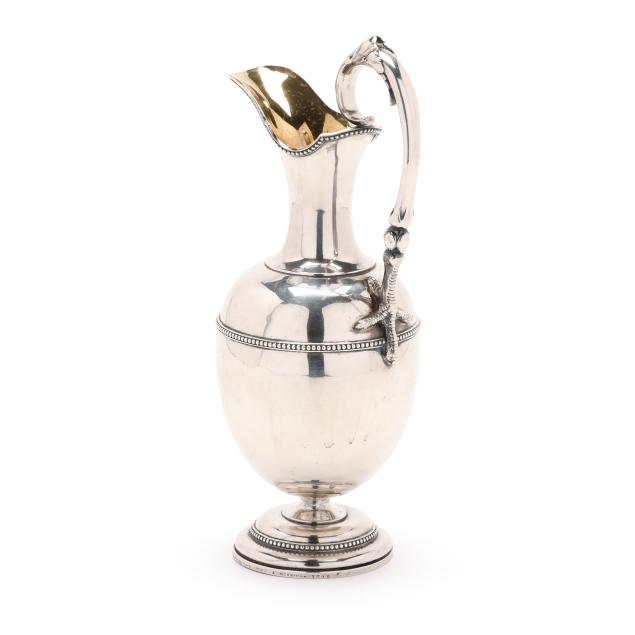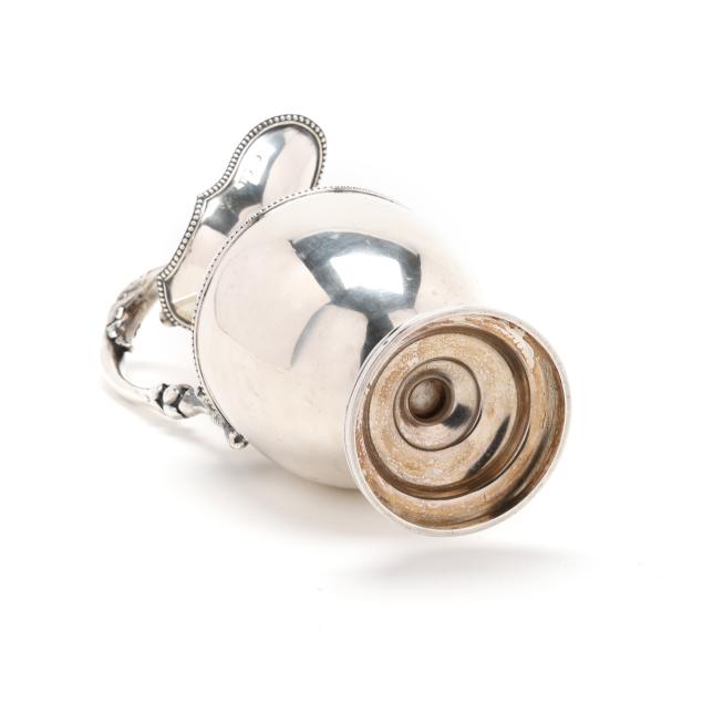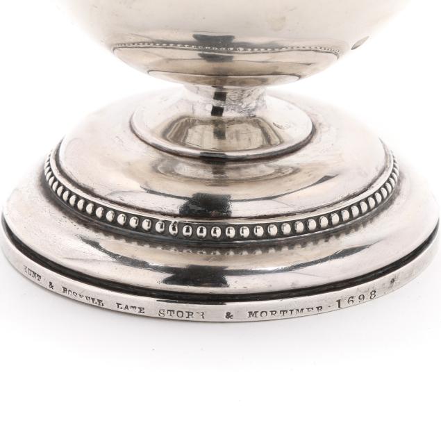 London (1862), with retail mark of "Hunt & Roskell Late Storr & Mortimer" to the foot, pattern number 1698, featuring bead course decoration to the foot, shoulder, and rim, a chicken claw handle, and gold wash interior.