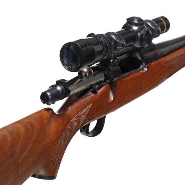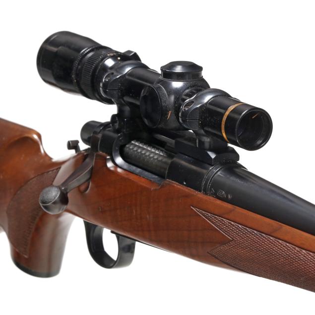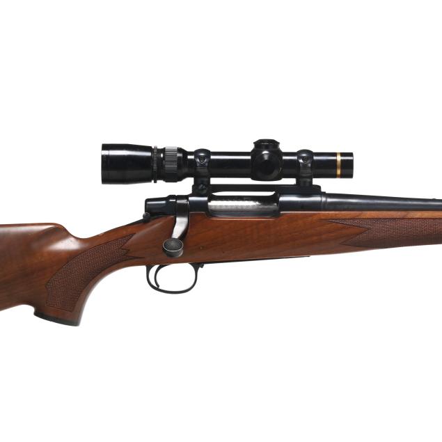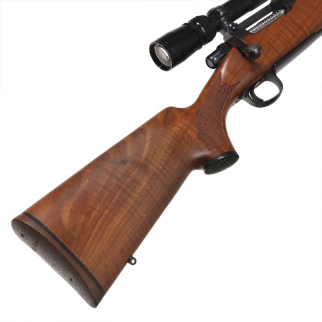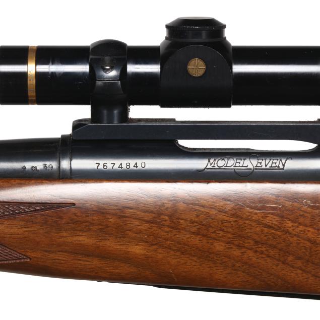 Serial number 7674870 present on left side of blued bolt-action receiver, text of REMINGTON ARMS COMPANY INC. ILION, N.Y. U.S.A. .7MM-08 present on blued steel 18 1/2 in. barrel, jeweled bolt, manual safety, one piece LEUPOLD base supporting LEUPOLD VARI-X III 1.5X5 low power variable scope, sling swivel studs, checkered walnut stock with capped pistol grip, factory recoil pad.