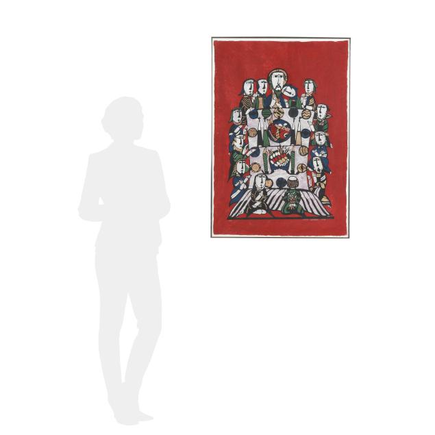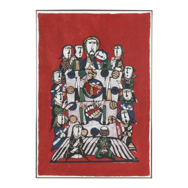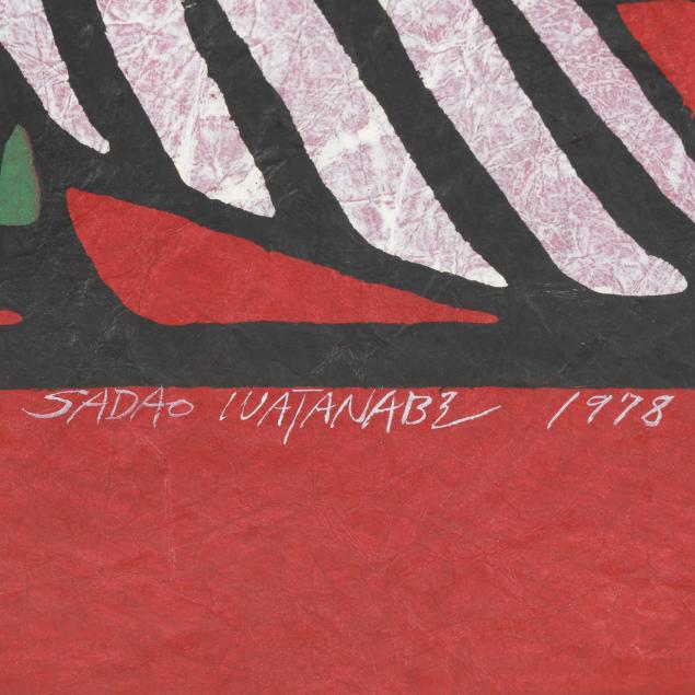 Private Collection, Bethesda, Maryland Sadao Watanabe was born in Tokyo in 1913, was baptized Christian in 1930, and throughout his career, based his designs exclusively on biblical subjects. This said, the Christian stories and figures of his works are interpreted via traditional Japanese techniques. Watanabe took part in the folk-art movement in Japan which began in the 1930s as an attempt to preserve various traditional arts, among them stencil printing, which Watanabe appreciated. Watanabe and Yoshitoshi Mori were the best-known 'sosaku hanga' artists who used the medium called kappazuri (stencil printing), a technique related to 'katazome' (stencil dyeing) which originated in Okinawa (the technique there was called 'bingata').