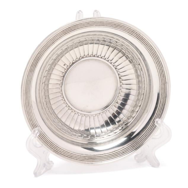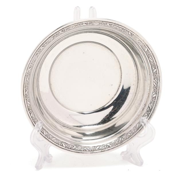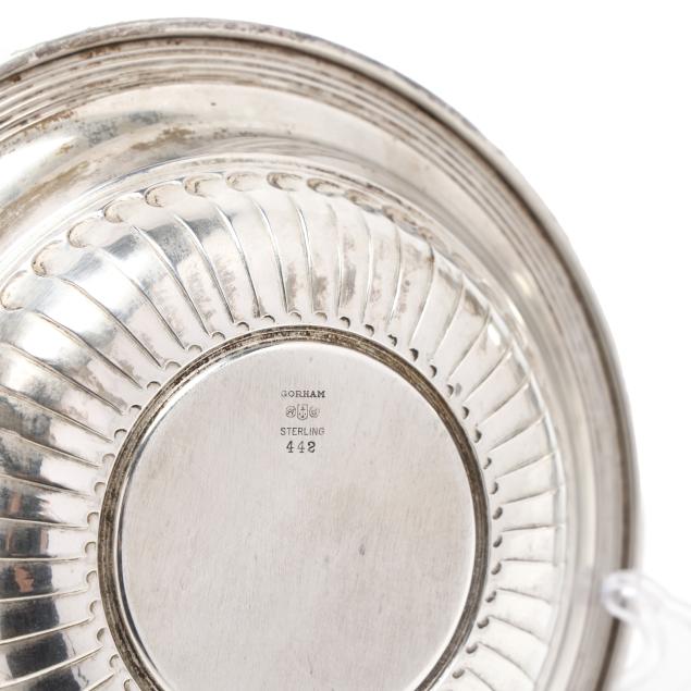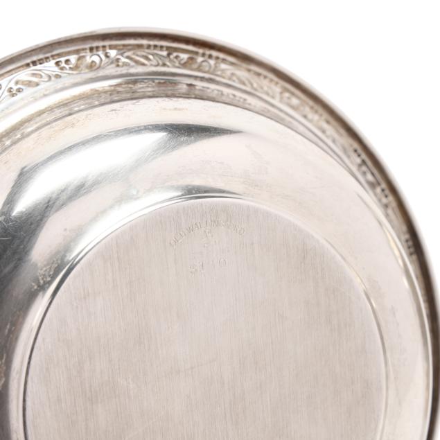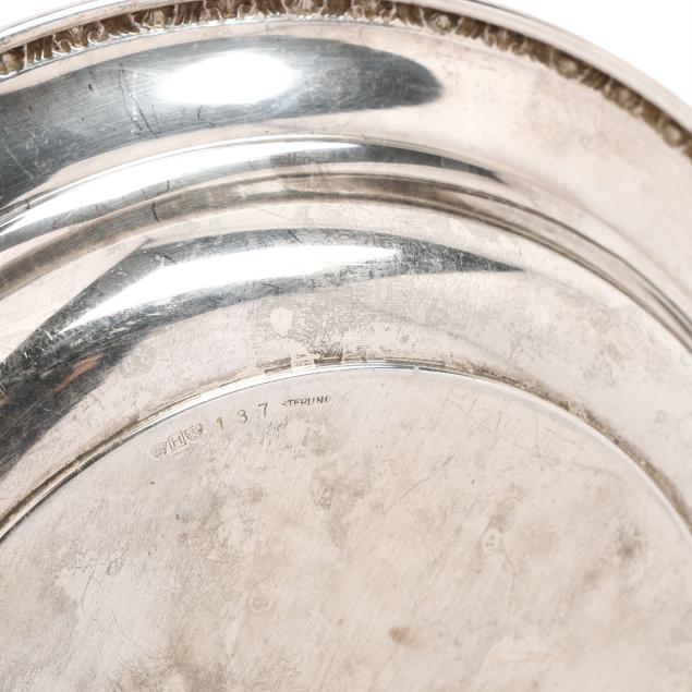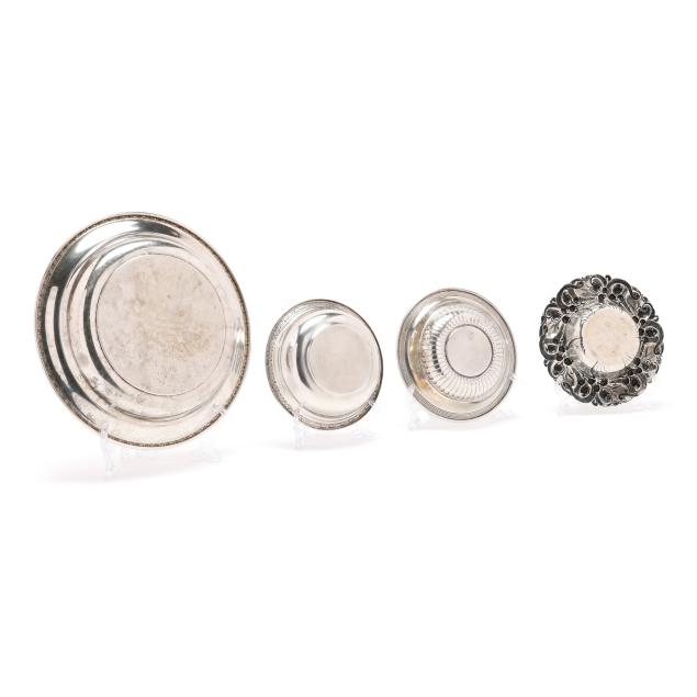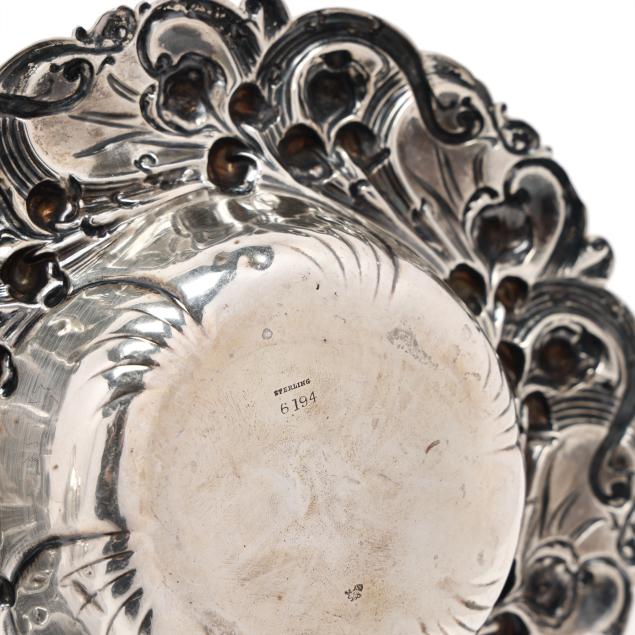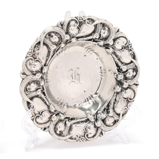 Includes a large serving bowl and (3) bon bon bowls by various makers including Whiting, Gorham, and other American companies; the Whiting bowl with Lily of the Valley decorated rim, monogrammed; all others not monogrammed.