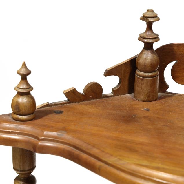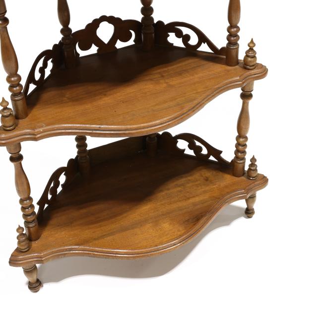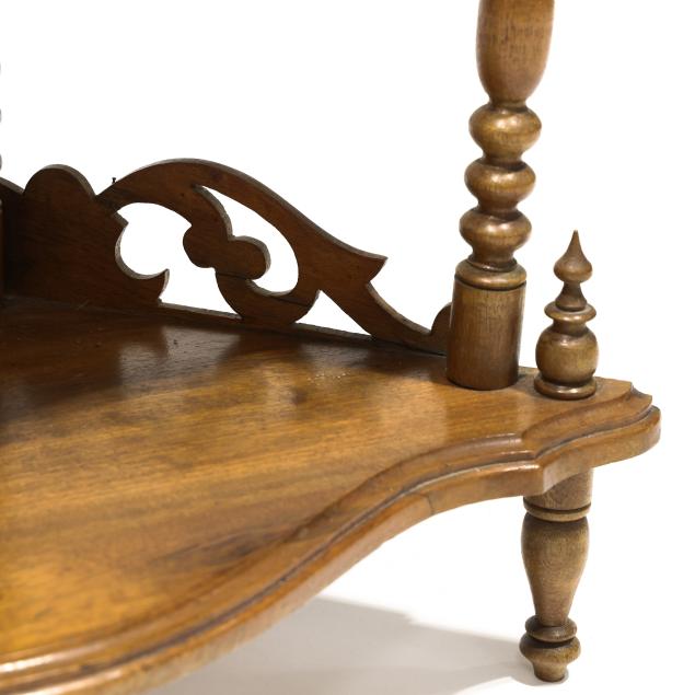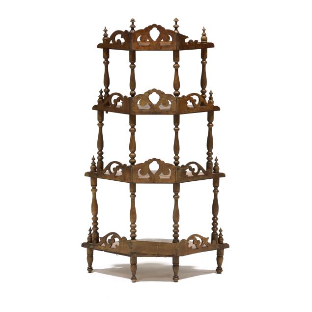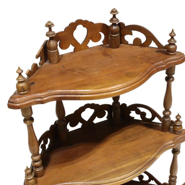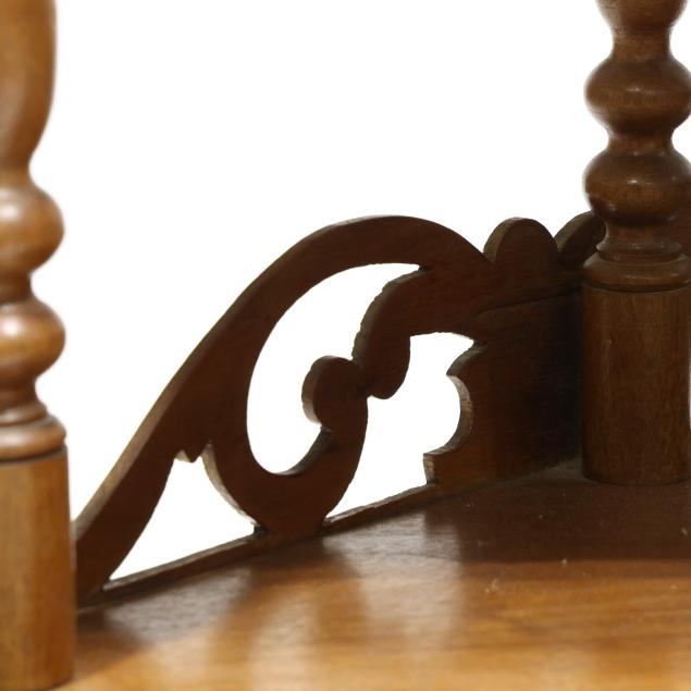 From the Collection of a Lady, Martinsville, Virginia Loss to the upper left gallery; joint looseness; chipping to finials; surface scratches to shelves.