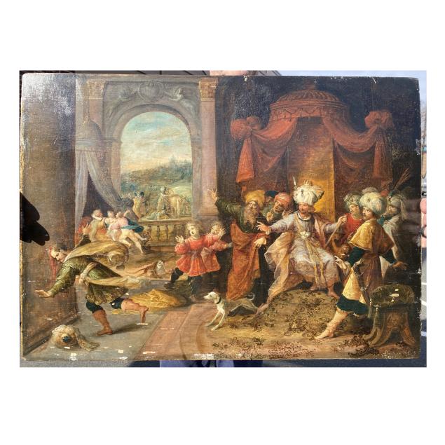 From the Collection of the late Nina Ayala Mallory Frans Francken II was a leading Flemish painter of the early 17th century and a central figure in the Francken family workshop in Antwerp. Trained by his father, Frans Francken I, he became an independent master in the Antwerp Guild of St. Luke in 1605 and quickly gained a reputation for his skilled handling of complex narrative scenes. Francken II played an important role in developing several popular genres of the period, including detailed historical and biblical tableaux, allegorical compositions, and the kunstkammer or “cabinet of curiosities” paintings that combined art, science, and collecting culture in a single image.