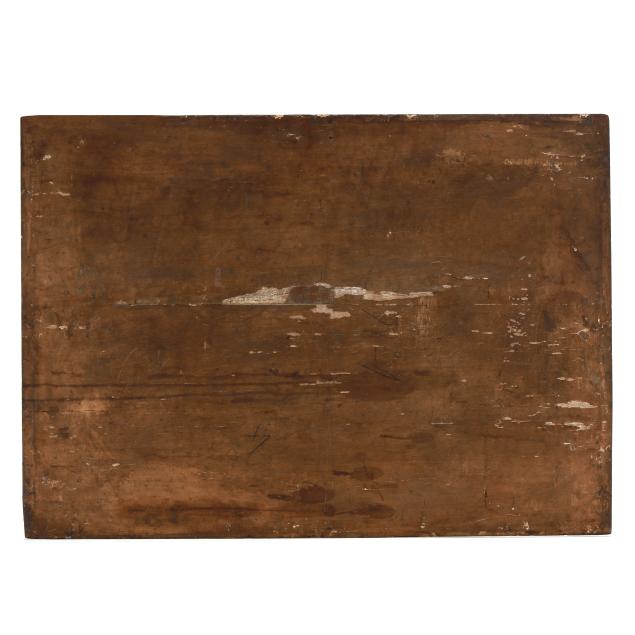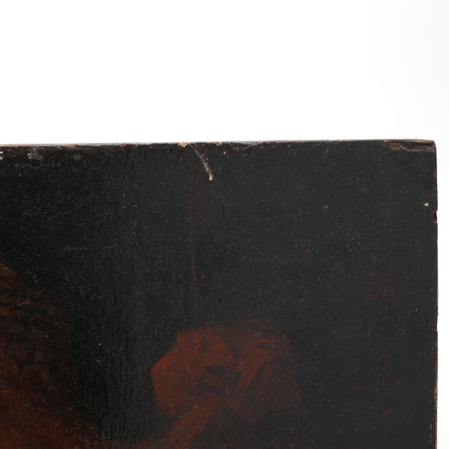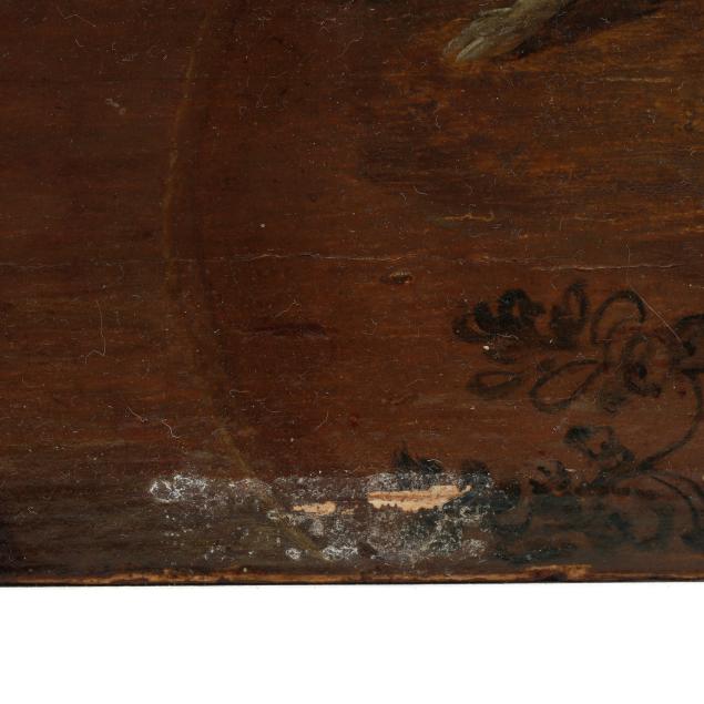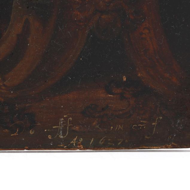 Oil on oak panel, bears the artist's signature and the date 1627 at lower right, presented in an antique frame.